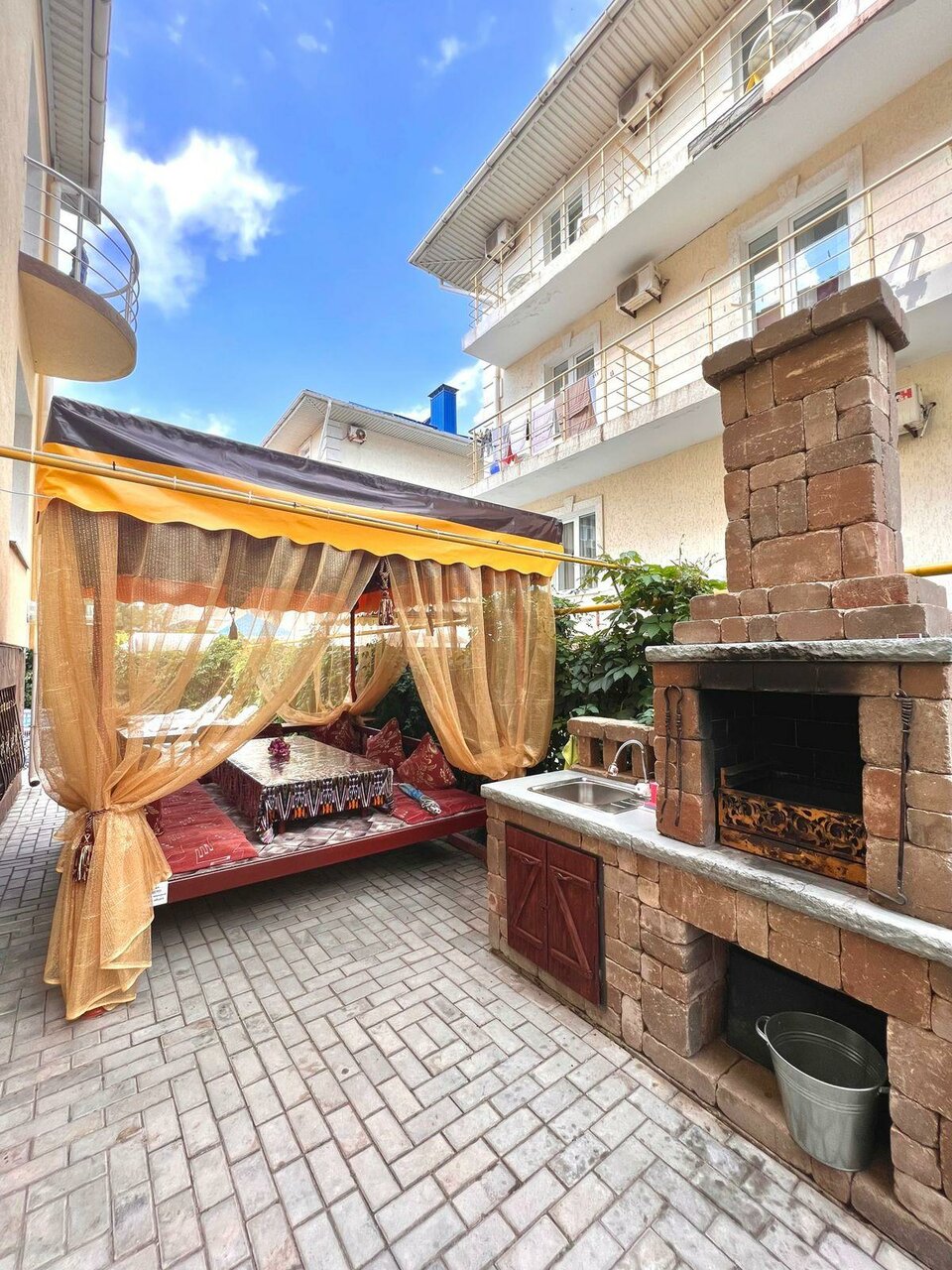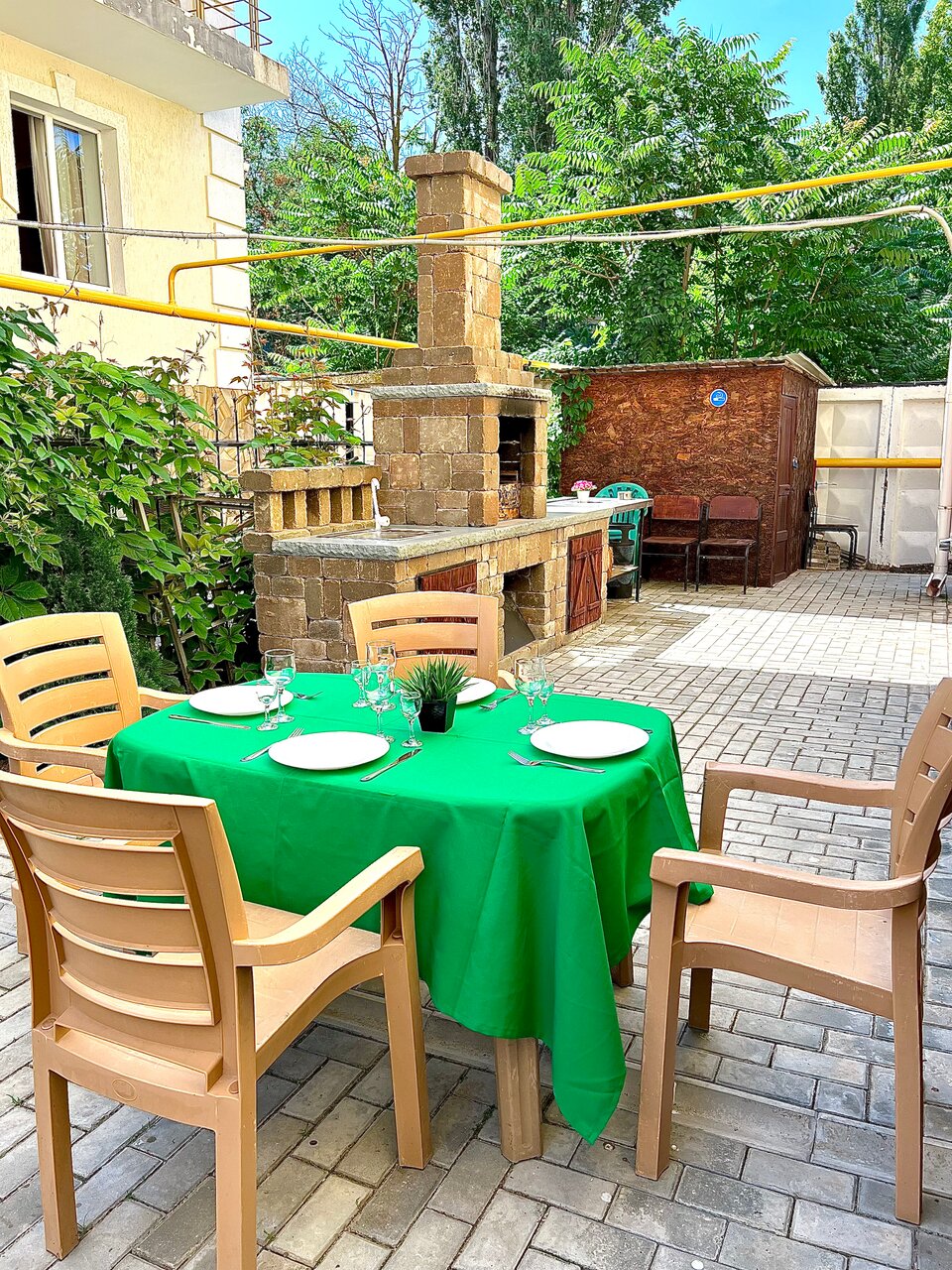 Отель находится недалеко от моря. В номере было чисто. Во дворе удобные столики и мангал!