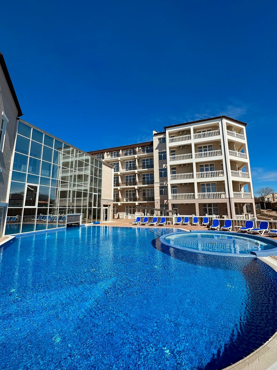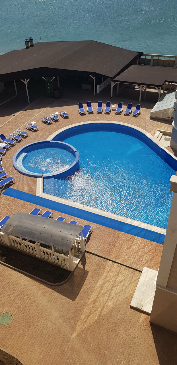 Бассейн хороший , на улице теплый , на 1м этаже немного сыроватые номера после шторма , завтрак понравился , есть игровая , завтрак вроде с 9 , немного поздно, так нам все понравилось , море рядом , есть парковка. , на Ресепшене не раскатали где завтрак , что есть игровая , бар , но мы и так все нашли )