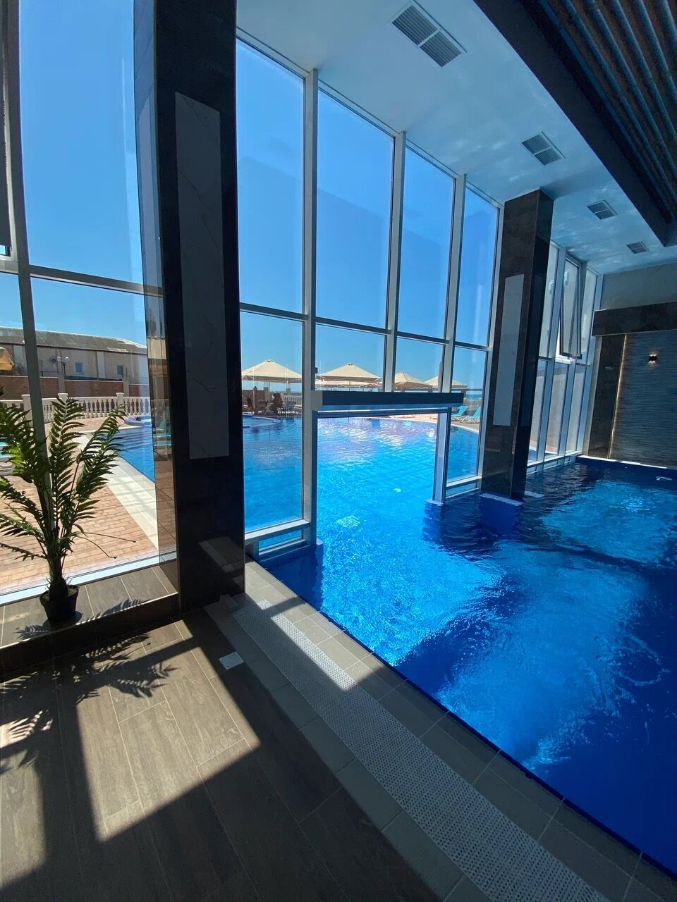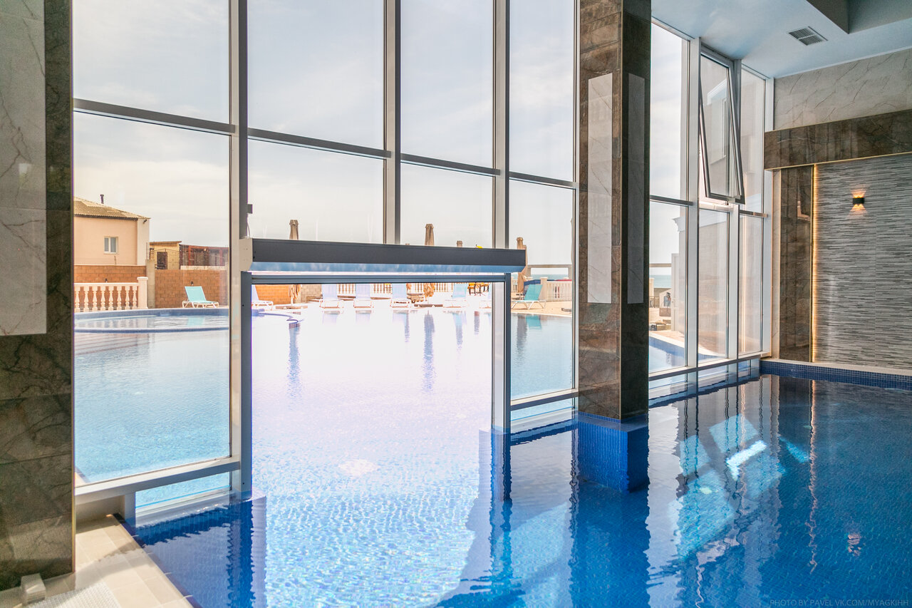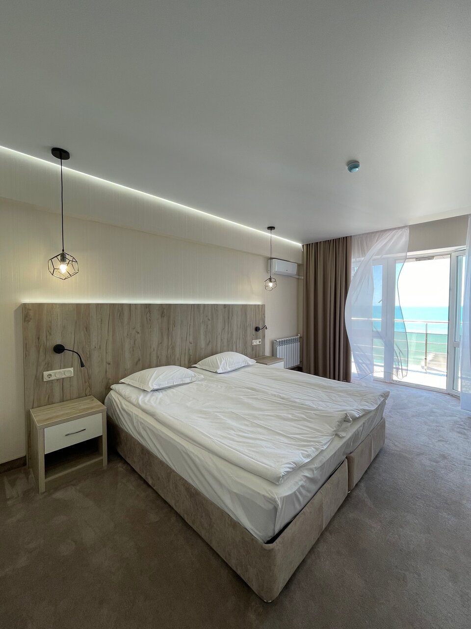 Удобства и услуги: ✔ Проживание в номерах с кондиционером, Wi-Fi, телевизором, санузлом и звукоизоляцией (от 5000–6000 ₽/ночь). ✔ Питание: ресторан, кафе, 2 бара, завтрак (по меню), доставка еды в номер. ✔ SPA и отдых: крытый и открытый подогреваемые бассейны, сауна, хаммам, баня, джакузи, оздоровительный центр, массаж. ✔ Пляж: собственный галечный, шезлонги, зонтики, бар на пляже. ✔ Для гостей: бесплатная парковка, трансфер (платный), велопарковка, проживание с животными, детский клуб, услуги няни. ✔ Дополнительно: круглосуточная стойка регистрации, лифт, прачечная, камера хранения, банкетный зал, караоке.