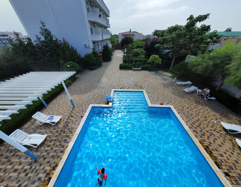 В этот раз мы не собирались в Николаевку, но получилось, что приехали. Через Букинг забронировали 2 номера в гостевом доме Dolce Vita на Прибрежной,45. Большая, ухоженная, утопающая в зелени территория, чистый бассейн(каждый день чистят), лежаки, душ, туалет. Две площадки в тени, под навесами со столиками, мангалом и даже с топчанами, чтоб по-татарски заседать. Номера есть с балконами и без, везде кондиционеры, холодильники, тв, санузел. На этажах и в холле кулеры с питьевой водой. На окнах сетки от комаров. Отлично убирают, меняют постельное белье и полотенца. На общей кухне можно приготовить еду, вся утварь для этого есть, рядом-просторная столовая с большим количеством столиков. Хозяева, администратор Александр и сотрудницы-гостеприимные, вежливые, очень приятные люди. Захотелось вернуться ещё раз. И это -мне…Рекомендую!