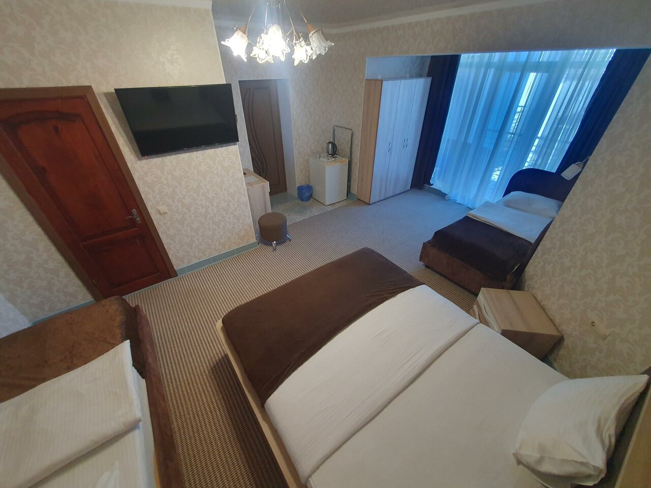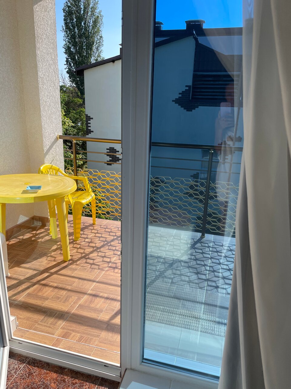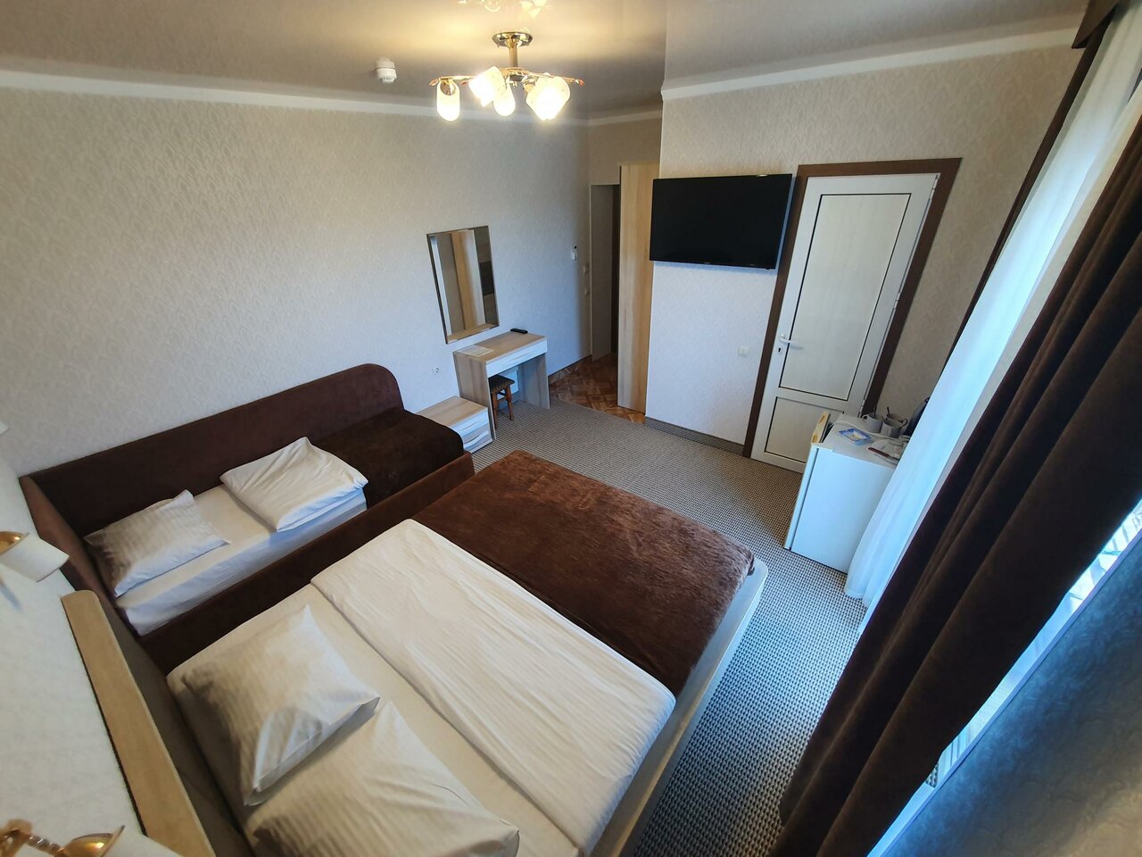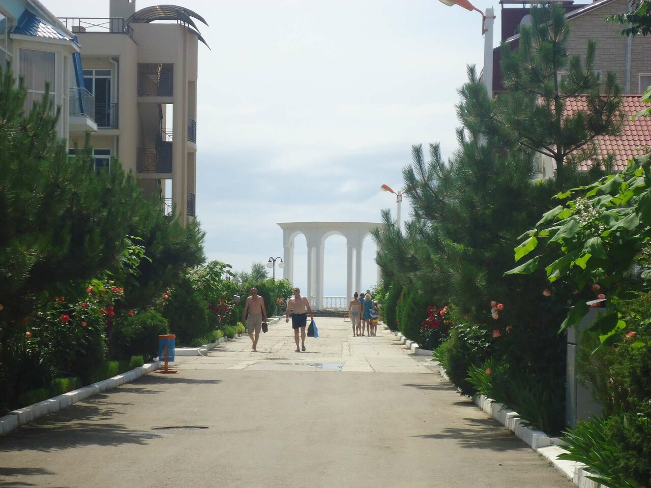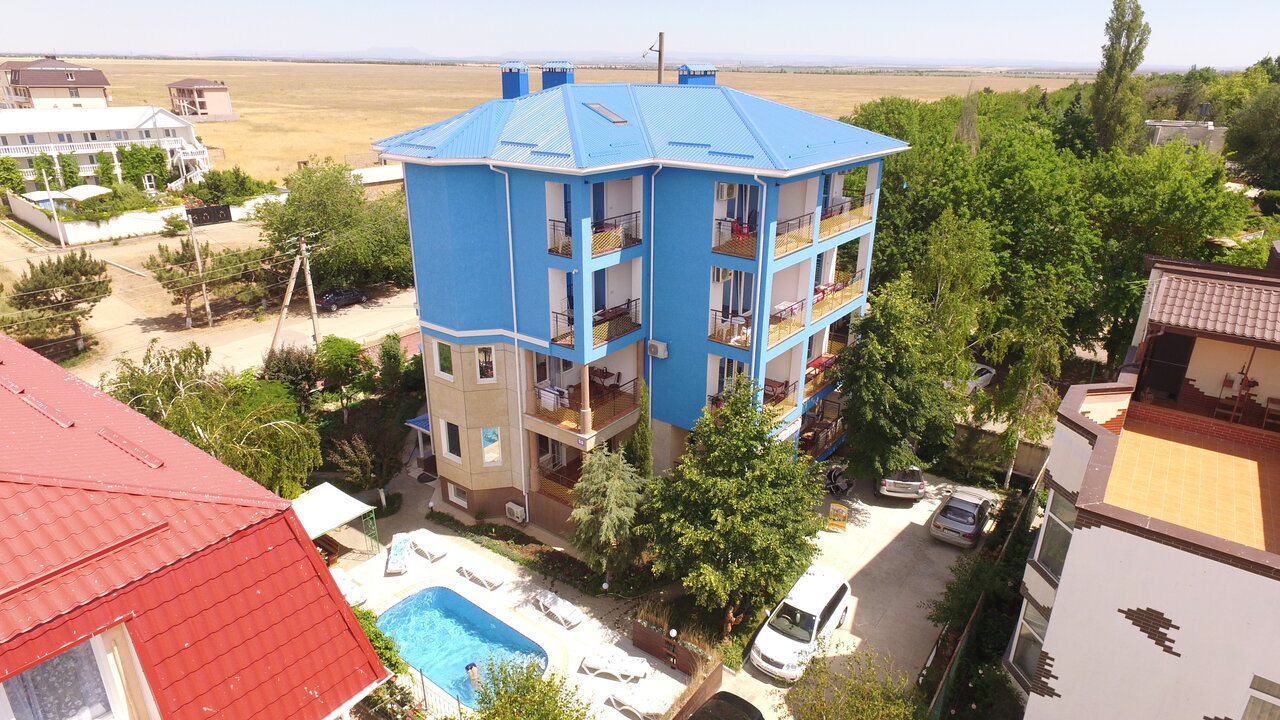 Отличное место:большие комнаты, гостеприимный и приветливый персонал, (в предыдущем рассматриваемом варианте было просто безразличие,даже я бы сказала пренебрежение, хотя сейчас людей в Крым едет мало) чисто, уютно, дёшево. Всё необходимое в наличии:холодильник, шкаф, тумбочки, чайник, полотенца, фен и даже сейф. На цокольном этаже микроволновка.Есть место для глажки, за отдельную плату стирка.Wi-fi.Во дворе бассейн, детская площадка, мангал со всеми пренадлежностями. Большой балкон, на котором мы каждый вечер отдыхаем. Море в шаговой доступности. И ещё всякие приятные мелочи. В общем:очень рекомендуем.