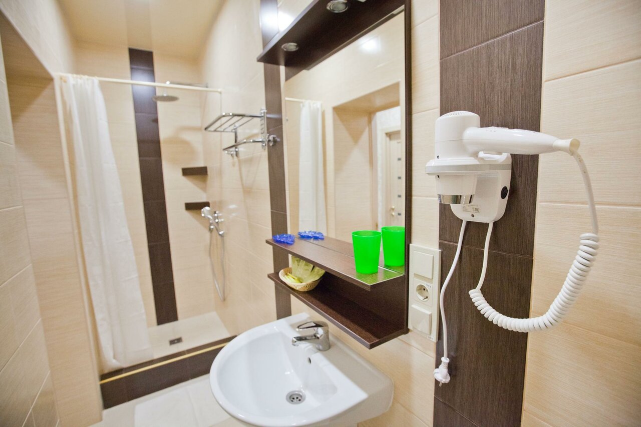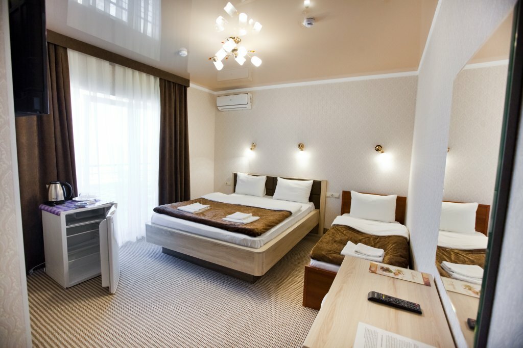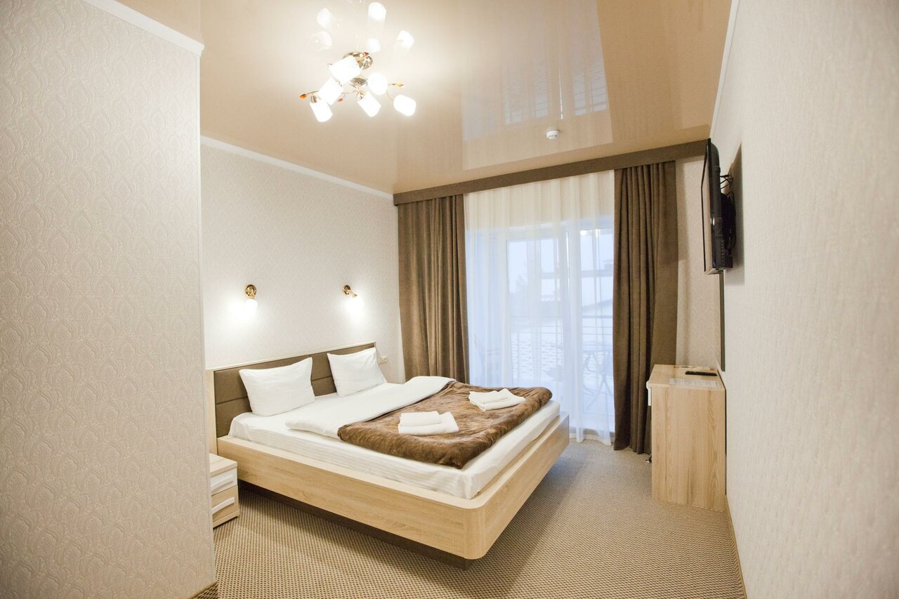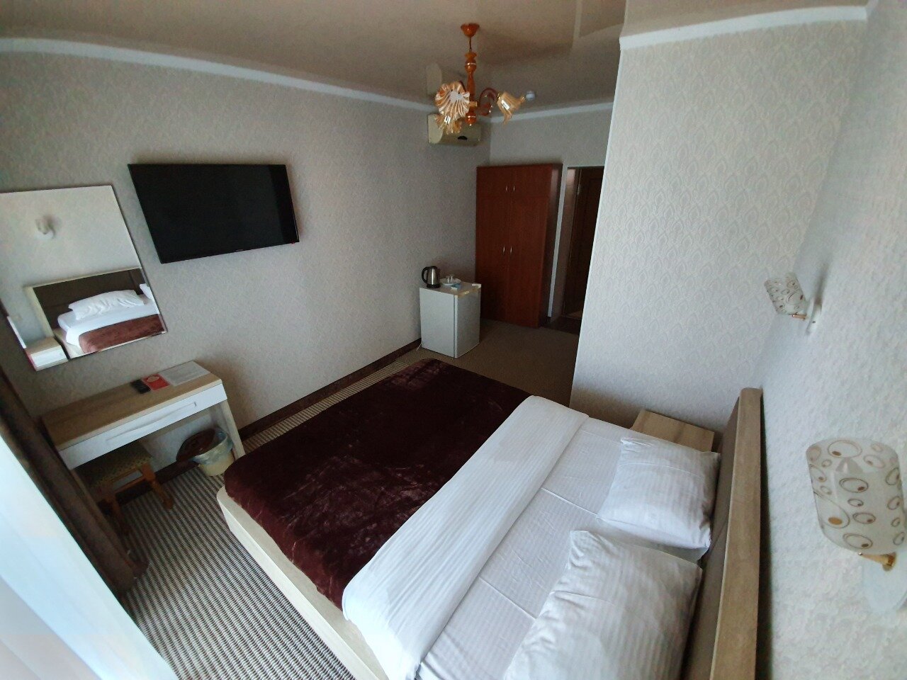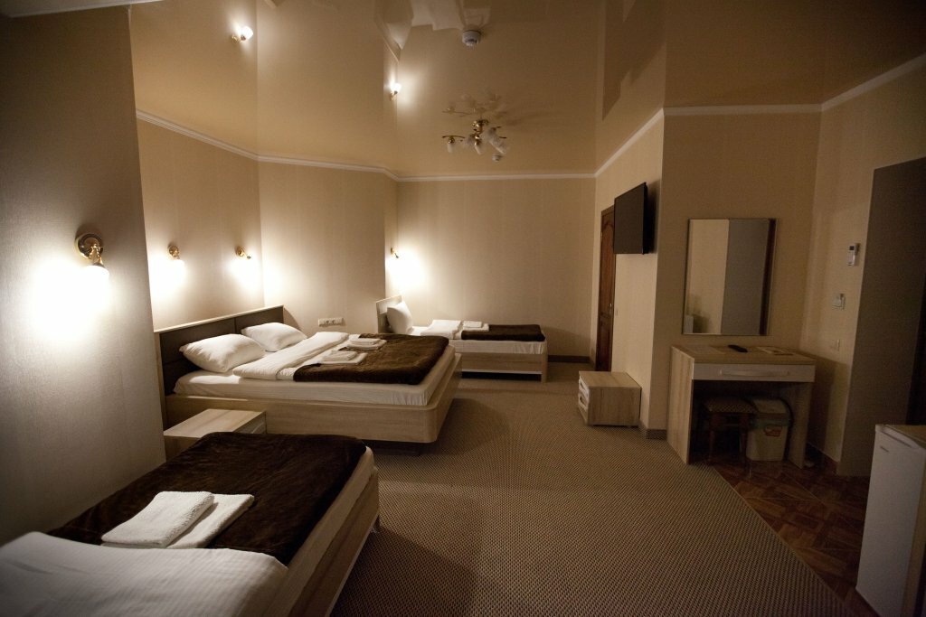 Люксы двухкомнатные 4-х и 5-и местные (30 кв.м), в каждом из которых имеется холодильник, электрочайник, фен, два полотенца на каждого, кондиционер, спутниковое ТВ, Wi-Fi доступ в интернет , сейф, душ, умывальник, туалет.