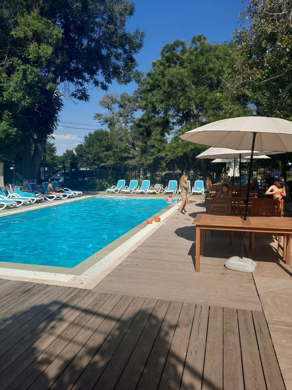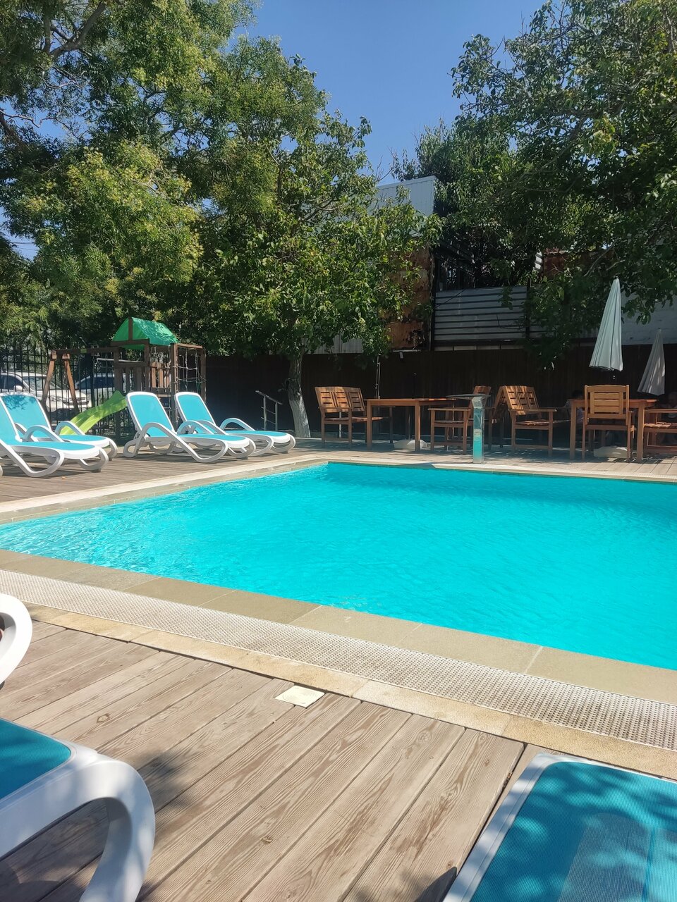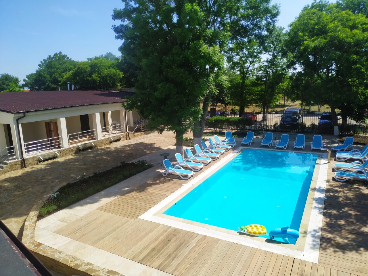 Хорошее место для спокойного отдыха, отдыха с маленькими детьми. Обслуживание достойное, всё самое необходимое предоставляется. Завтрак, входящий в стоимость проживания, хороший(многообразие блюд + выпечка, фрукты). Море близко, чистое, вид из окон (2 и 3 этаж) классный. Из минусов — ценник для посёлка, и не обогревающийся бассейн