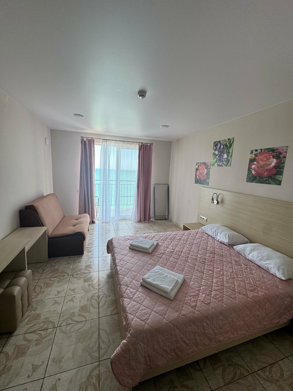 Отдых авг-сен 2024. Великолепная гостиница очень приличного уровня. Номера среднего размера, на взгляд метров 20 кв. В номере присутствует все что надо. Номера выходят на море, так что спать приходится под прекрасный морской прибой. Море в 5 метрах от входа. Пляж — мелкая галька, ходить удобно. Лежаки включены в стоимость. Уборка мусора в номере каждый день, полотенца — раз в 2 дня. Уборка самого номера по запросу. Особо хочу отметить еду. Если завтрак обычный шведский стол. То обеды и ужины уже в баре. Хорошие большие и вкусные порции. Средний чек на одного взрослого человека ок 600-800 руб. В общем очень рекомендую, тихое чистое место. Спокойный отдых.