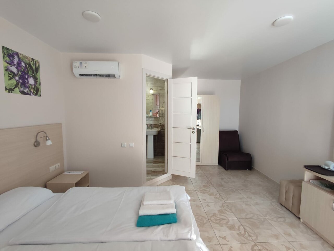 Прекрасный вид из номера, вкусная кухня, чисто и уютно! Свой бассейн, выход в море , жезлонги! Номера убираются каждый день , а также смена полотенец и постельного белья