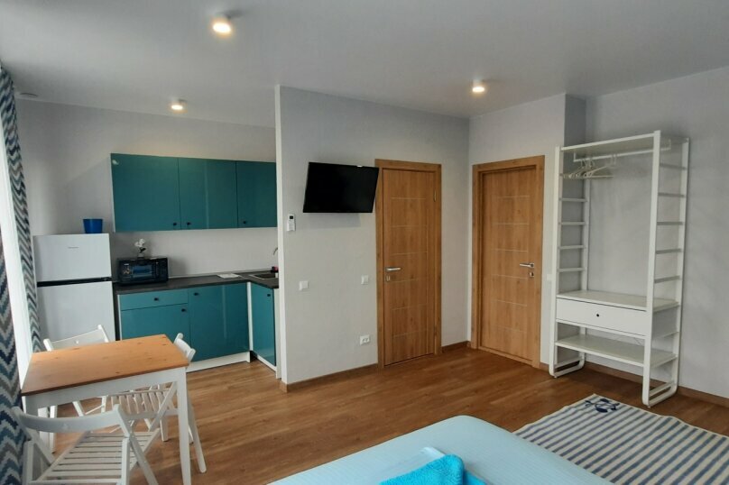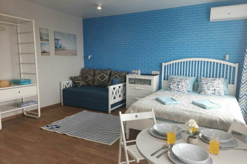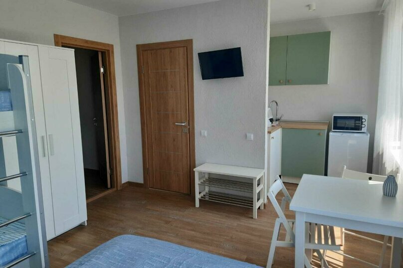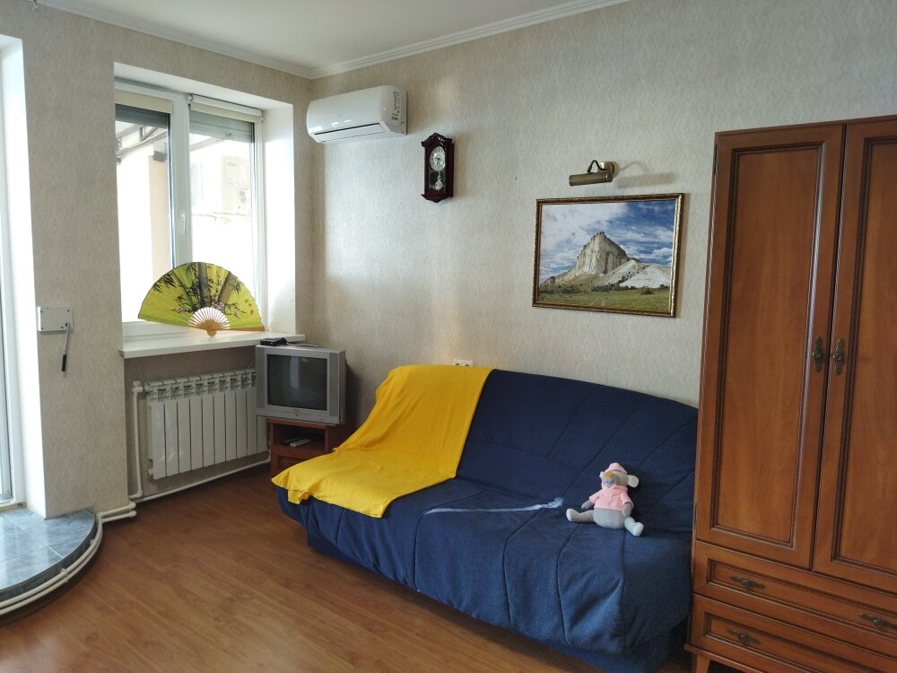 Номер с частичным видом на море или горы, двуспальной кроватью и раскладной кушеткой. Каждая студия может разместить 4-х гостей на основных спальных местах с новыми ортопедическими матрасами. А так же мини-кухня с посудой и бытовой техникой, обеденна