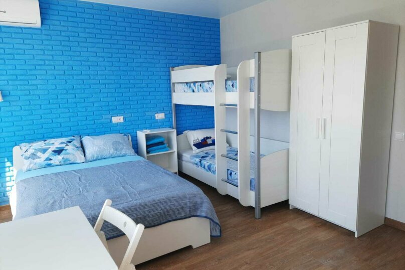 Семейный номер с двухспальной и 2-х ярусной кроватью разместит комфортно всю семью. В номере так же есть мини-кухня с посудой и бытовой техникой, обеденная зона для 4 гостей.
