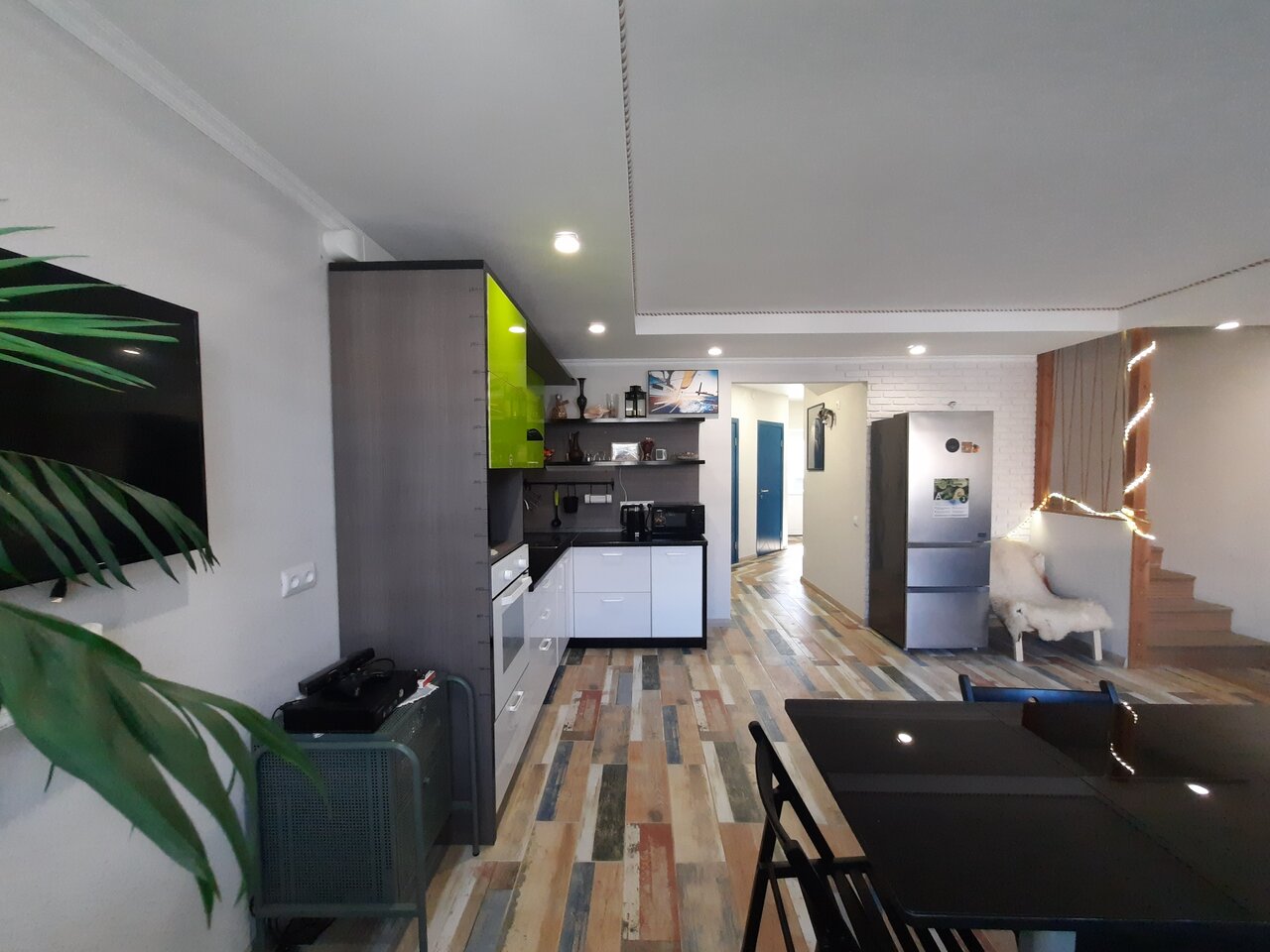 - Наличие кухонной зоны (холодильник, микроволновка, индукционная плита, посуда).