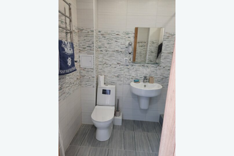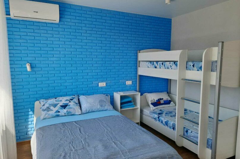 Предлагает номера (от 3500 до 6500 ₽/ночь) с кондиционером, Wi-Fi, телевизором, холодильником и кухонными удобствами. Есть звукоизоляция, фен, чайник и микроволновка. До моря — 63 м, имеется собственный галечный пляж.