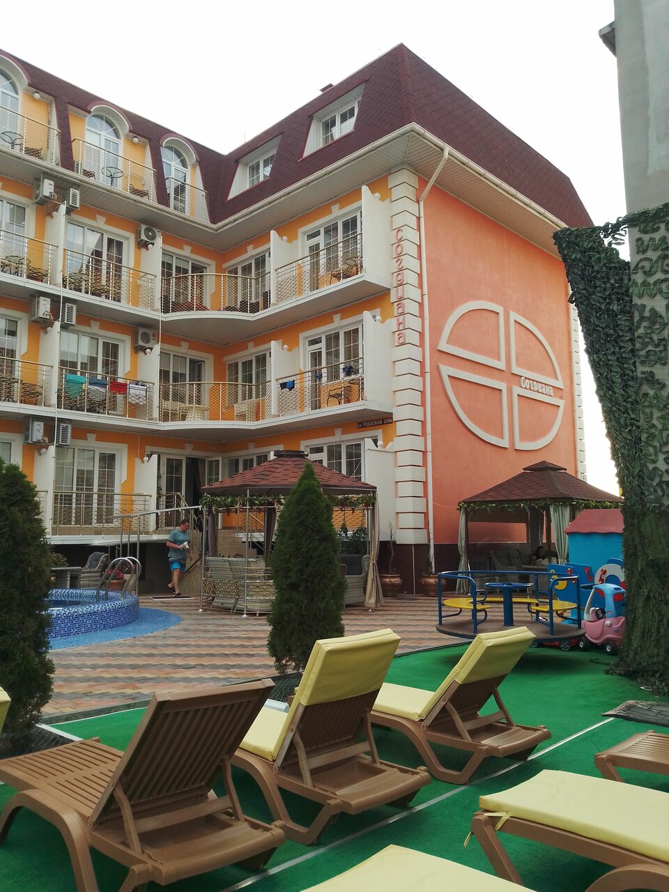 Замечательный семейный отель для отдыха в Крыму!!! Доброжелательные хозяева, приветливый персонал. При отеле есть своя столовая где можно заказать завтрак, обед и ужин, порции большие и вкусные. Номера убираются своевременно и качественно. Номера уютные есть холодильник, телевизор, сейф, чайник, кондиционер, сервиз. На территории имеется свой бассейн с подогревом, шезлонги, беседки, столики, мангальная зона. Действует режим тишины с 23:00 до 08:00. Цены ниже чем на всём побережье. До моря 5 минут хотьбы прогулочные шагом. Бесплатная парковка для гостей. В шаговой доступности рынок, магазины, кафе. Прекрасно провел время. Всем рекомендую!!!