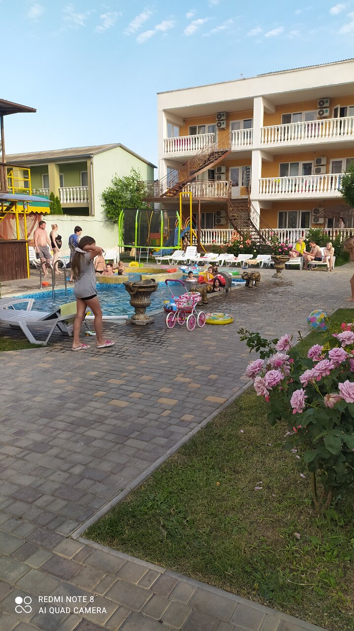 Отличное место для отдыха с детьми- игровая, детский бассейн, настольный футбол, настольный теннис, мини футбол, качели. Ещё можно заказать завтрак, обед и ужин- все сделано по-домашнему, вкусно и по демократичной цене. До моря минут 5-7, пляж не благоустроен и достаточно много мух, но плюсы значительно перевешивают. Рекомендую!