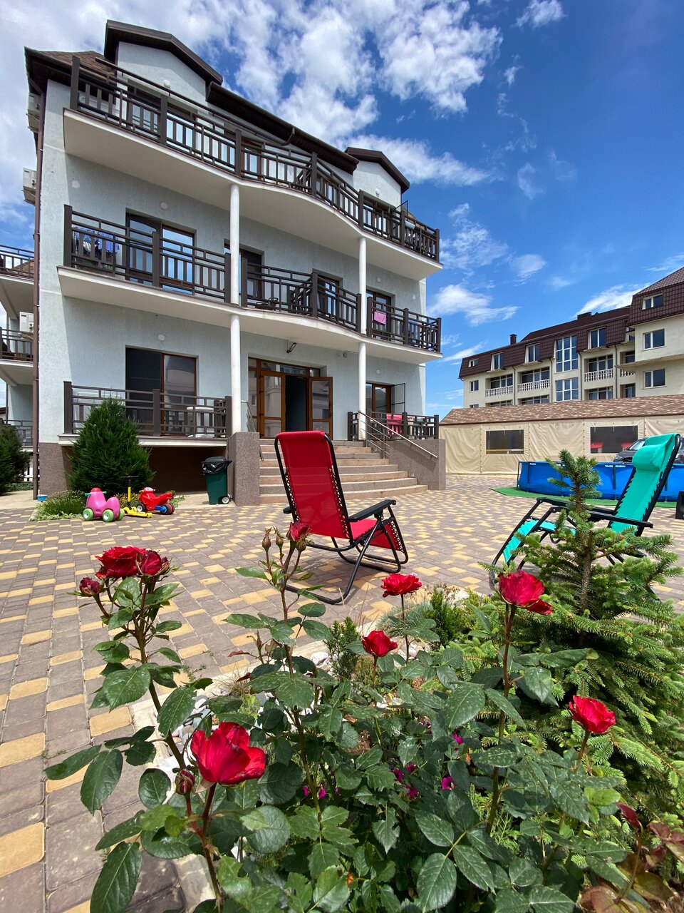 Замечательный новый отель. Номера чистые, уютные, есть всё необходимое для хорошего отдыха: телевизор, холодильник, фен, чайник, посуда, балкончик со столиком и стульями. Выдают полотенца, по 3 на каждого плюс пляжные. До пляжа 5 минут прогулочным шагом с отвлекающимися на всё детьми. Территория ещё в процессе обустройства, но уже есть беседка с мангалом и качели. Хозяйка Наталья очень милая и отзывчивая женщина, к ней можно обратится с любым вопросом. Мы остались очень довольны, что остановились именно здесь!