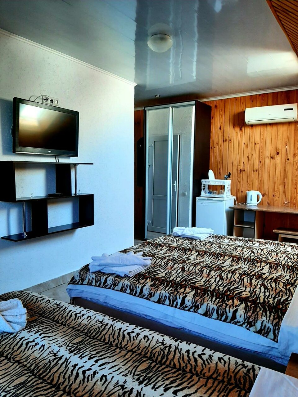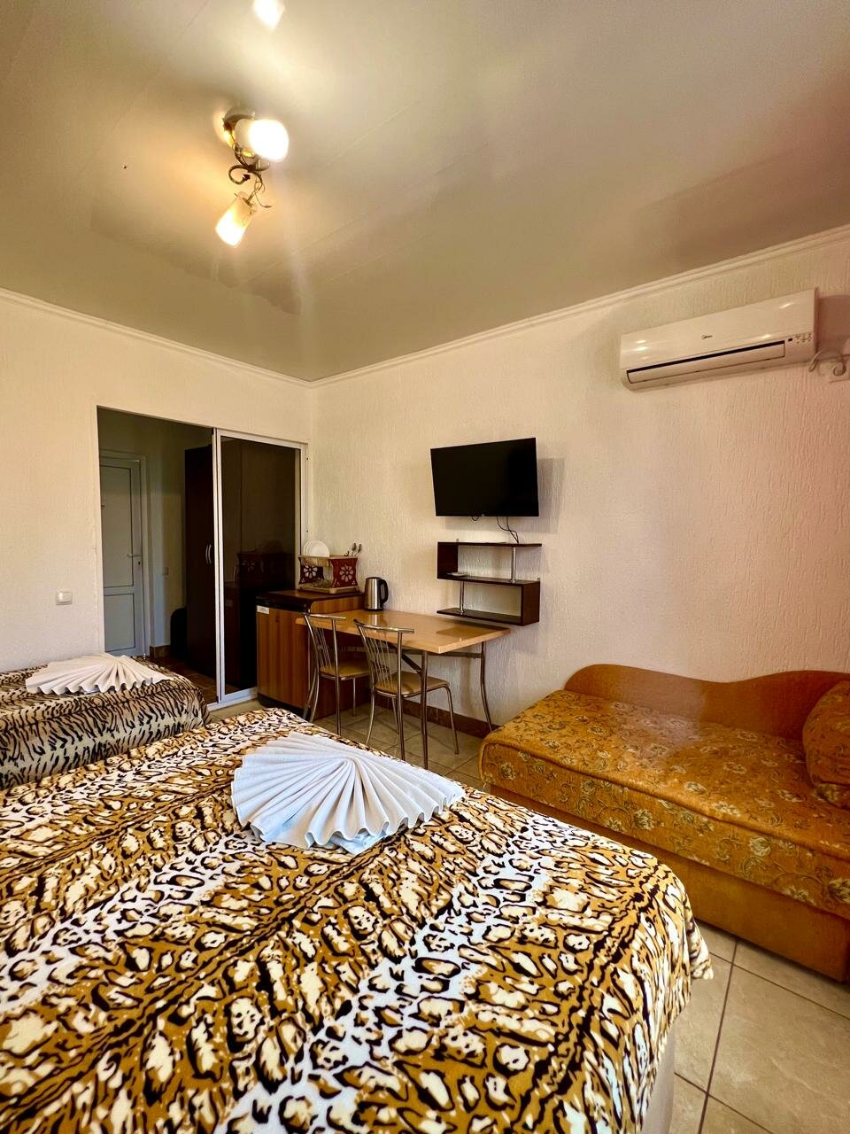 Удобное расположение на берегу моря ( 5 минут ). Небольшие ,но уютные номера , уборка — каждый день . Питание на заказ по меню ,не дорого и вкусно. Мы очень довольны.