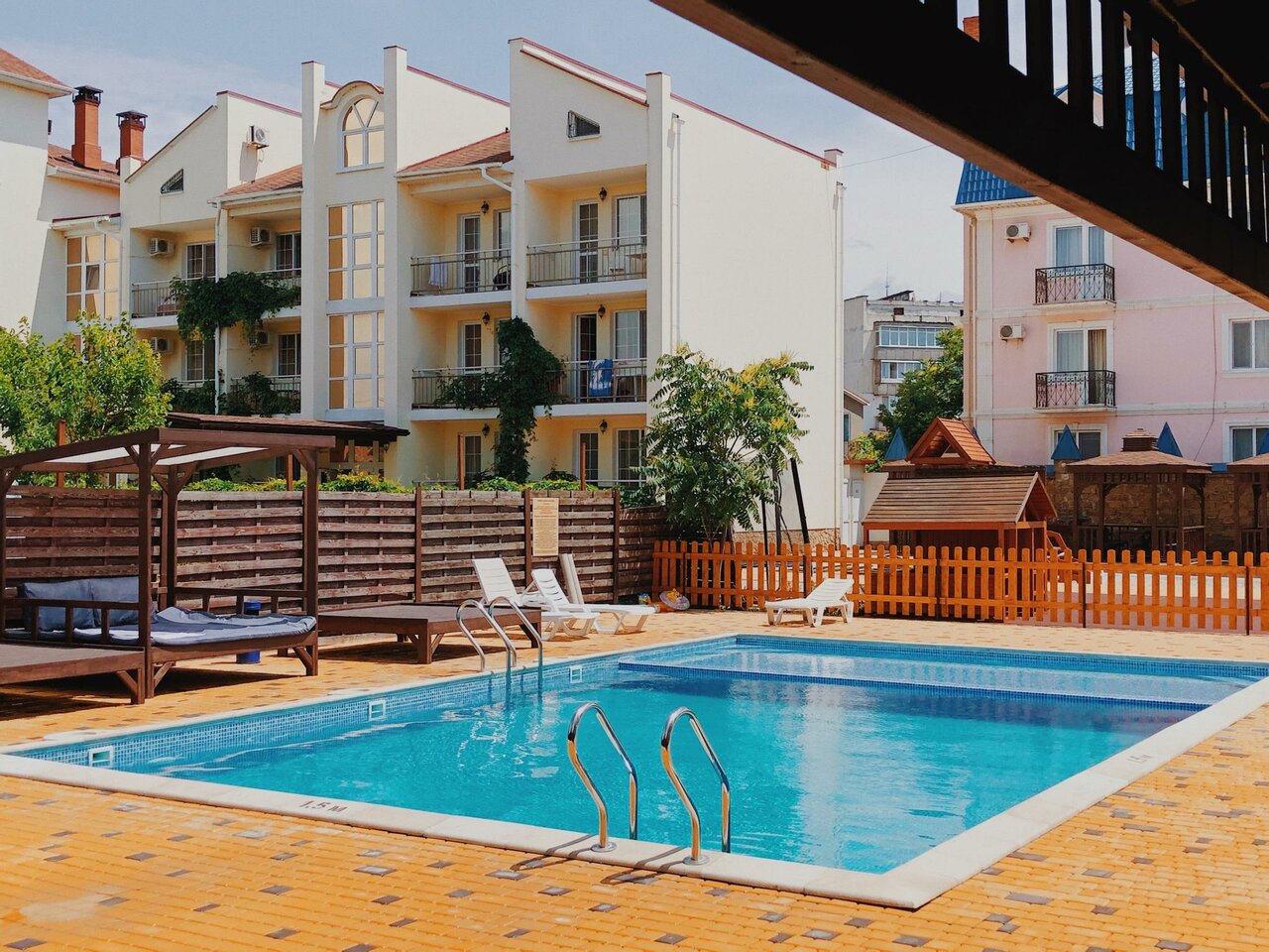 Хороший отель. Нам очень понравилось. И бассейн и номер( у нас был двухкомнатный с кухней) и территория с мангалами, беседками,баром.