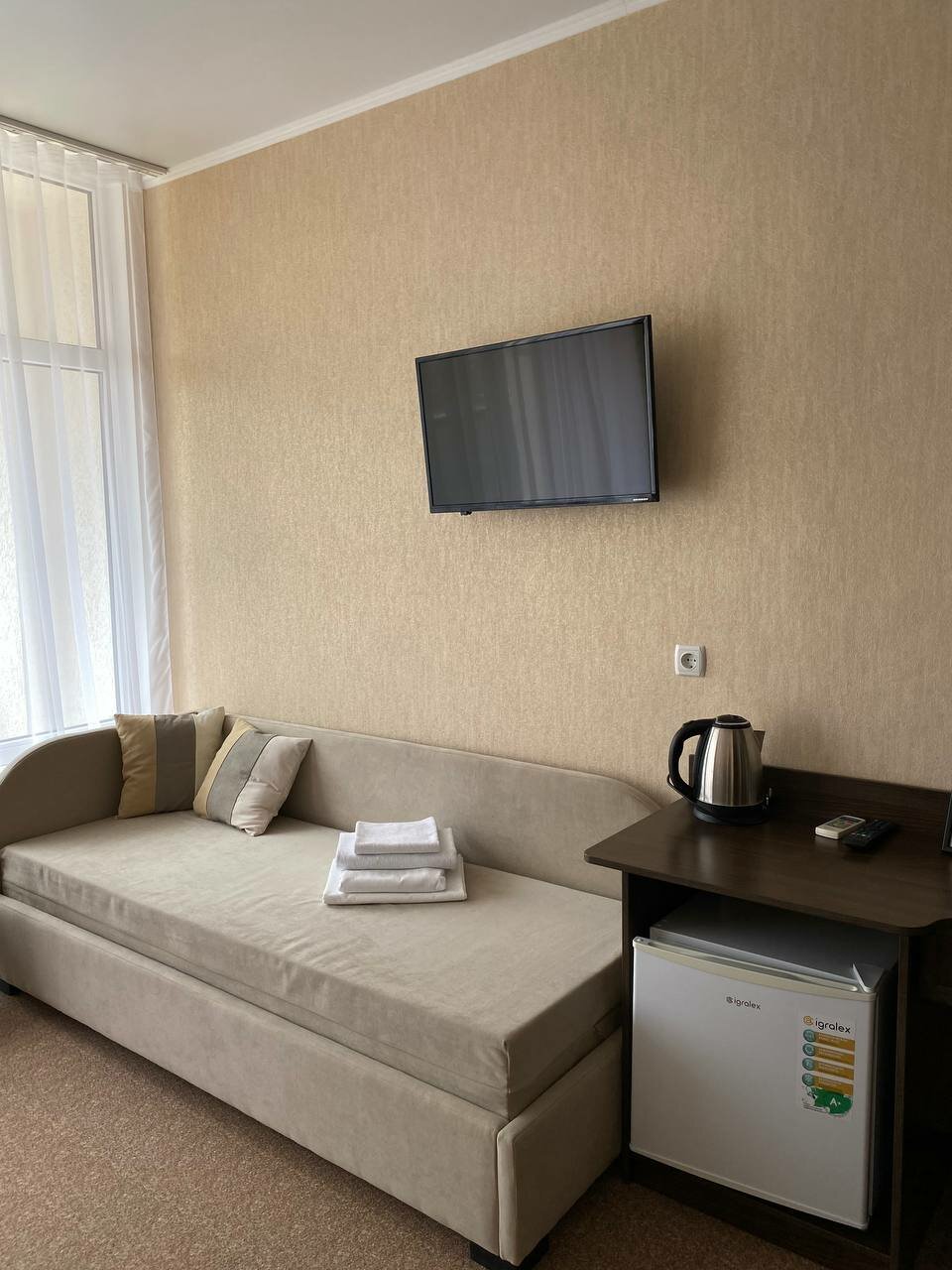 Номер предназначен для комфортного размещения двух максимум трех человек.Площадь 20 кв. метров.В номере:• холодильник,• кондиционер,• телевизор,• двуспальная кровать с ортопедическим матрасом,• посуда,• Wi-Fi-интернет,• санузел (душ, туал...
