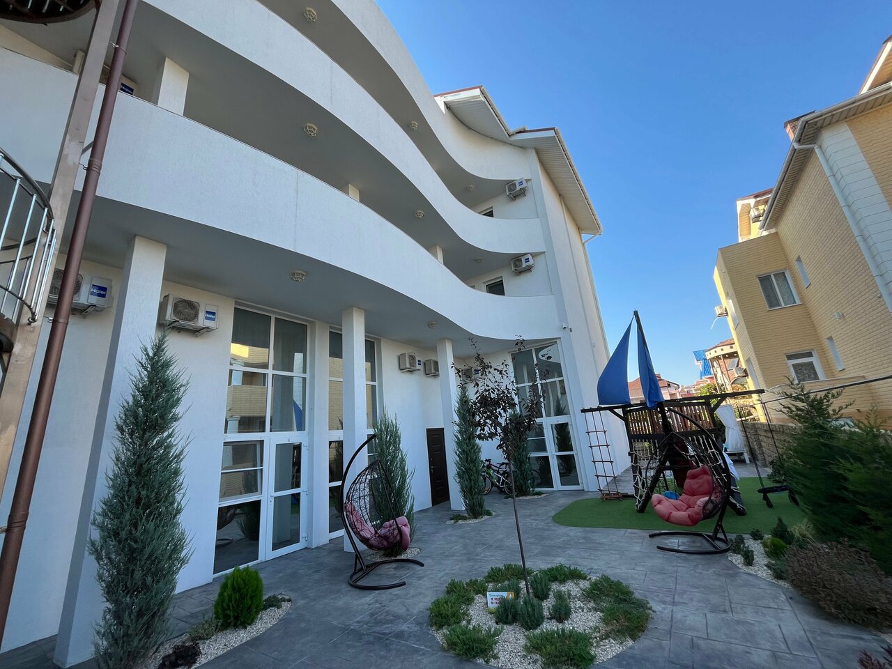 - Детская площадка и батут на территории.; Возможность продления проживания.; Чистый галечный пляж и теплое море.; Возможность пользоваться мангалом.; Чистые, просторные номера с современным ремонтом.
