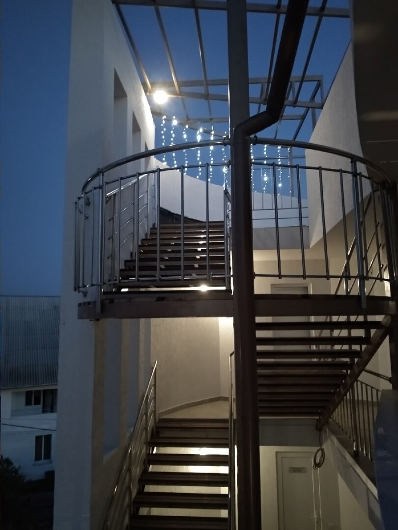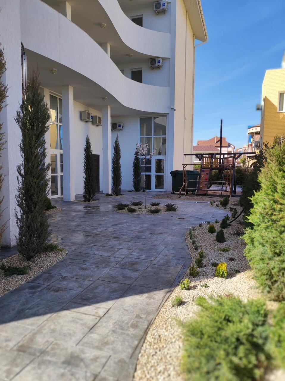 Отдыхали с 8.08-18.08. 2 взрослых, 2 детей.С ж/д вокзала Саки трансфер—600 Приехали утром, до заселения еще было время—сходили на пляж. Жили в двухкомнатном номере на 3 этаже. А номере есть уголок с кухней( индукционная плита, большой холодильник, микроволновка, раковина, чайник, кружки, тарелки, бокалы, сковороды, кастрюли, ложки, вилки, в общем все, чтоб можно было приготовить что-то свое). В шаговой доступности есть несколько приличных столовых. Питались там. Море чистое, спокойное, теплое. Пляж галечный. Детям даже зашел—домой привезли кучу камушек На крыше бассейн, большой и маленький. 7 летний ребенок подпрыгивая, прекрасно себя чувствовал и в большом. На территории есть мангал, рядом раковина. Детская площадка. В общем, нам а е очень понравилось( даже лучше, чем в Витязево). Спасибо хозяевам за все! Роман, Анастасия! Процветания вашему отелю!