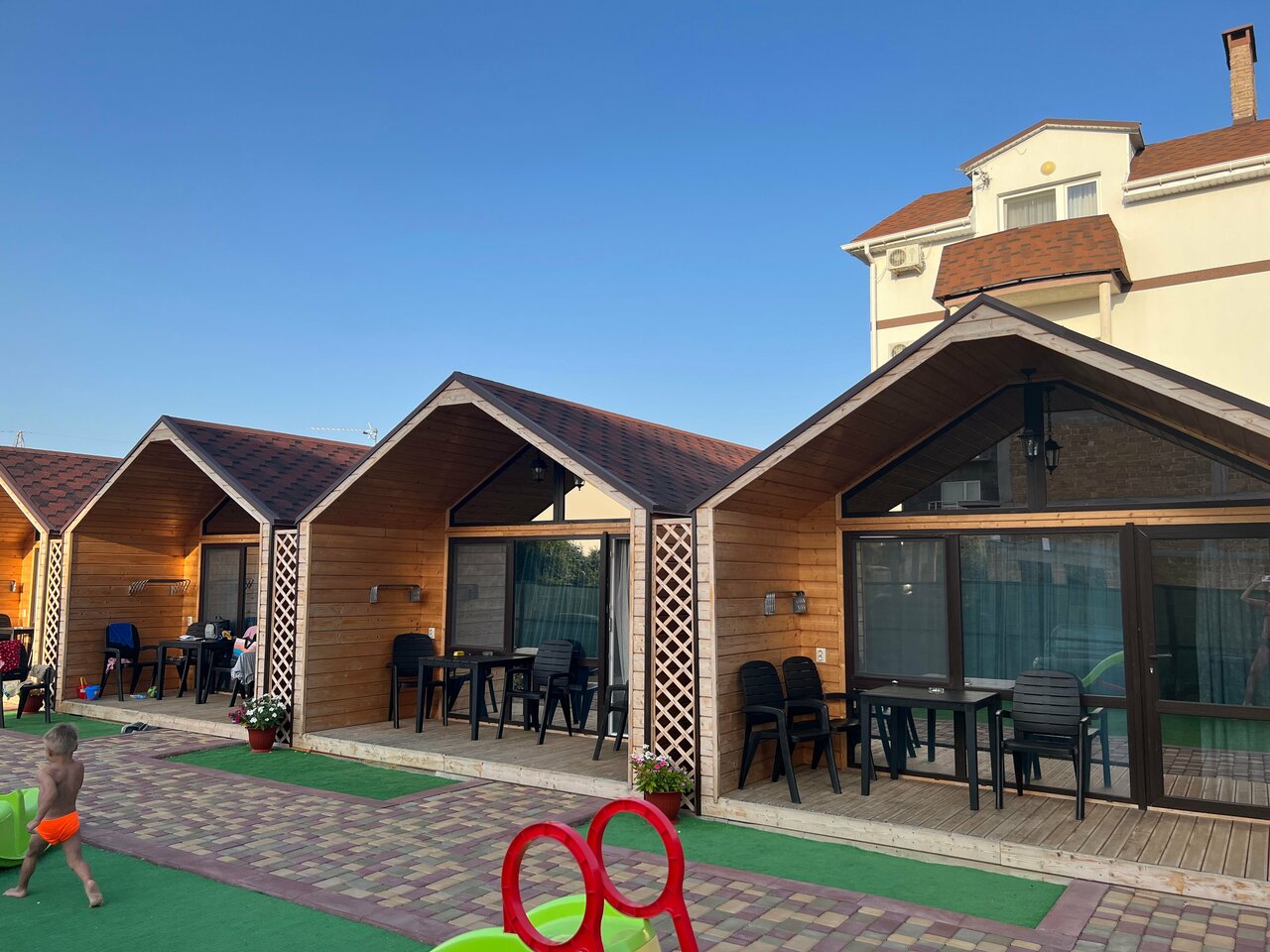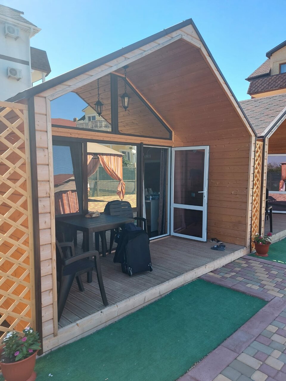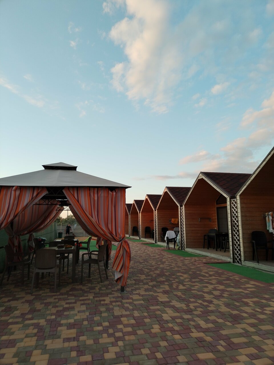 Очень удобные домики есть все необходимое. Уютно, добротно. Мило. Хорошо что индивидуальный вход. Комфортный отдых. Можно готовить самим. Тихо спокойно не считая рева Су постоянно с 6 утра совершающих полеты )) прямо над головой .
