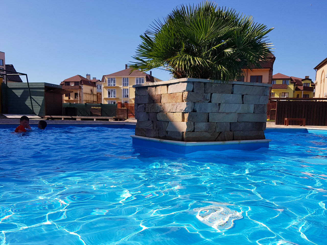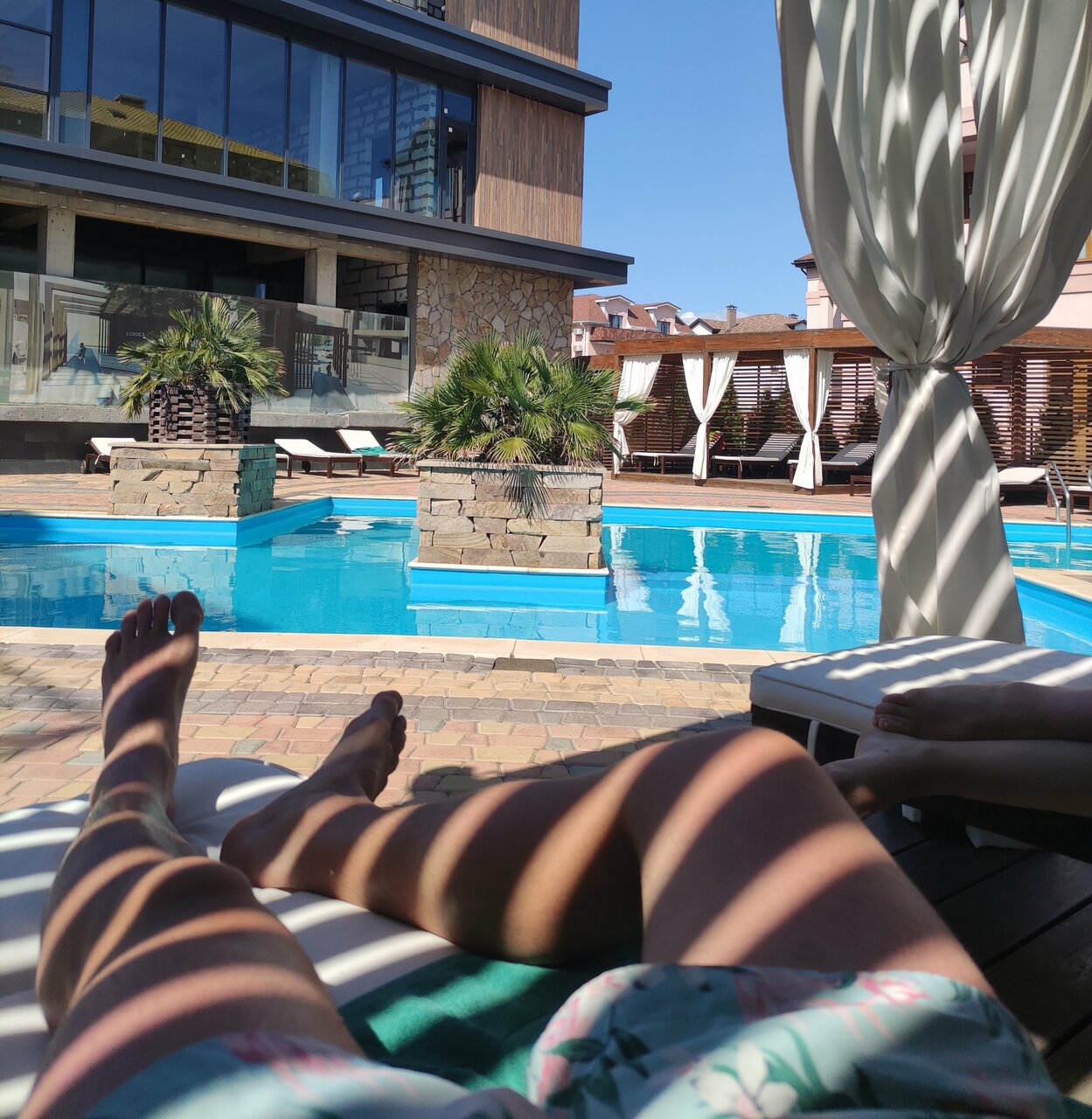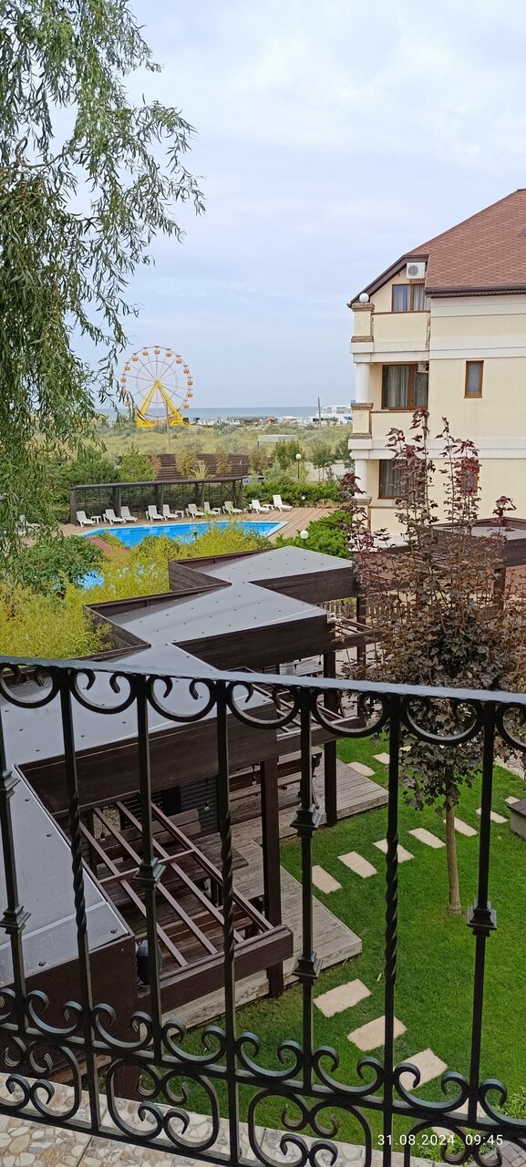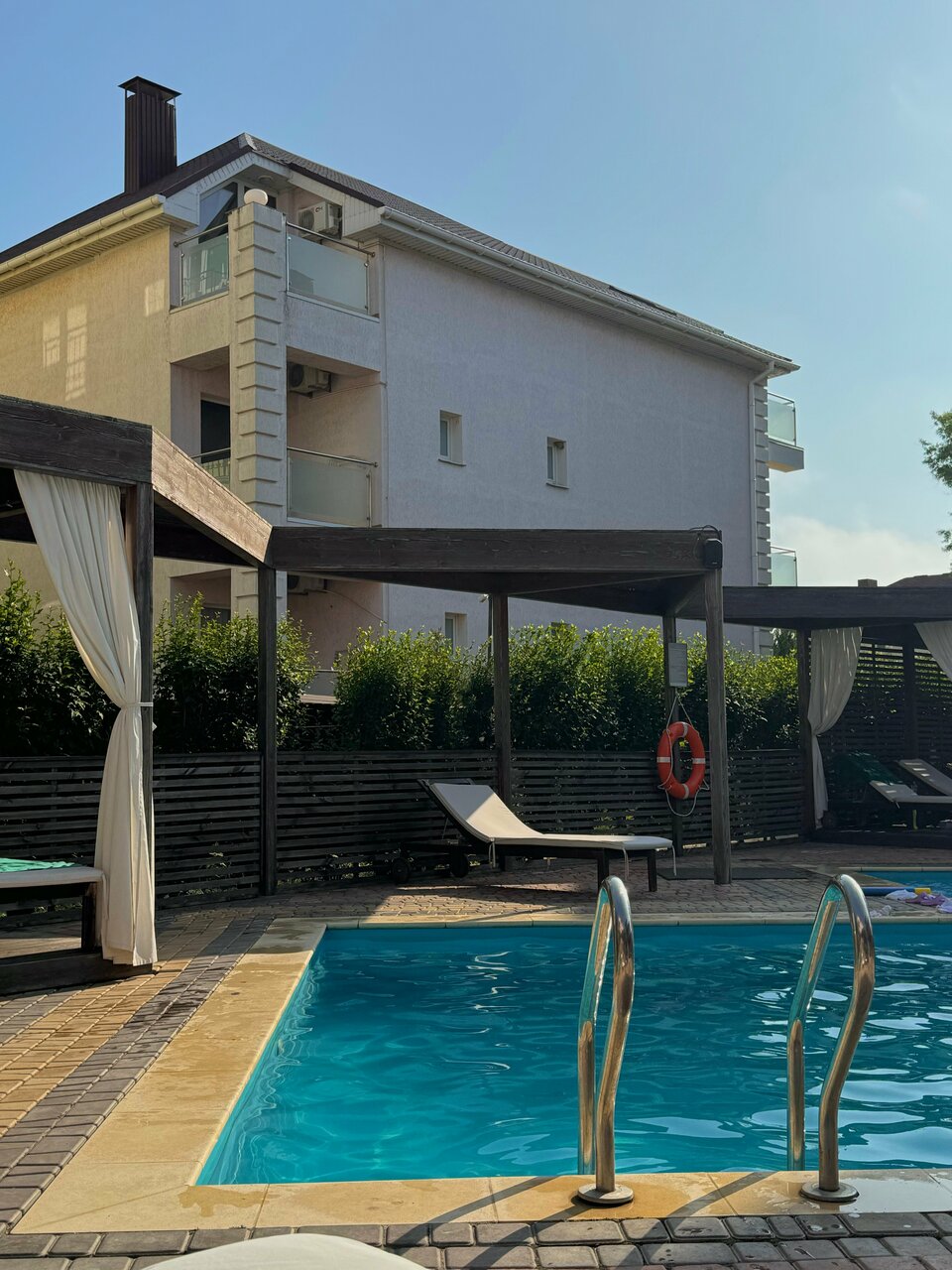 Прекрасный отель. Персонал молодцы, реагируют оперативно. Хороший бассейн. Комнаты чистые. Есть всё необходимое. Для детей организована площадка, аниматоры. Хорошая мангальная зона. Свой пляж, шезлонги, зонтики. Для пляжа отдельные полотенца. Один минус — нет питания. Ещё пожелание: возле бассейна организовать туалет.