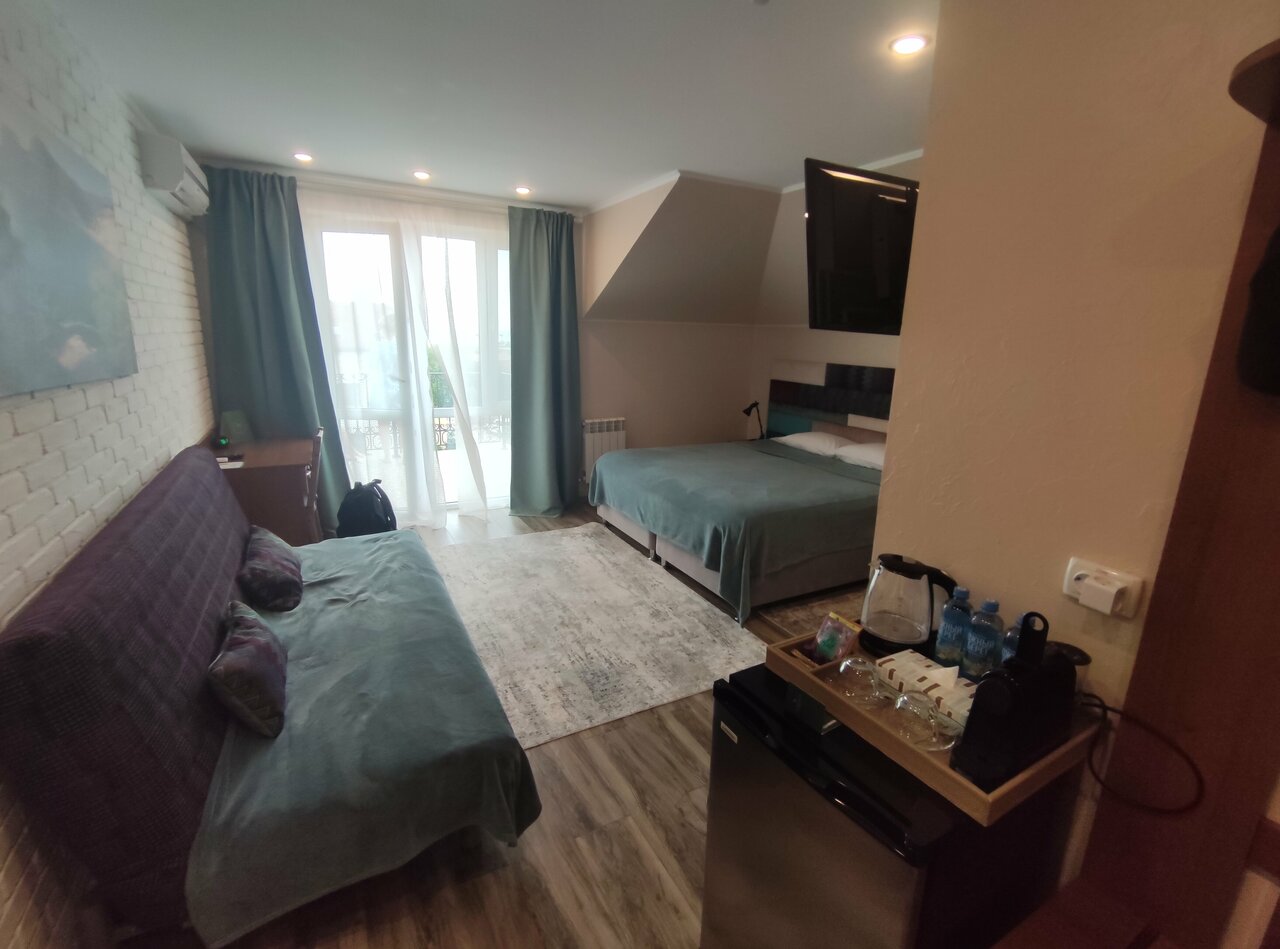 однокомнатный 3-4-х местный номер. В номере: санузел с душем, кондиционер, ТВ, холодильник, чайник, сейф, фен. Полотенца банные и пляжные.