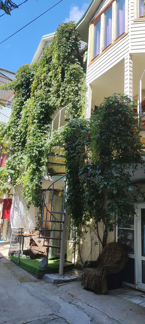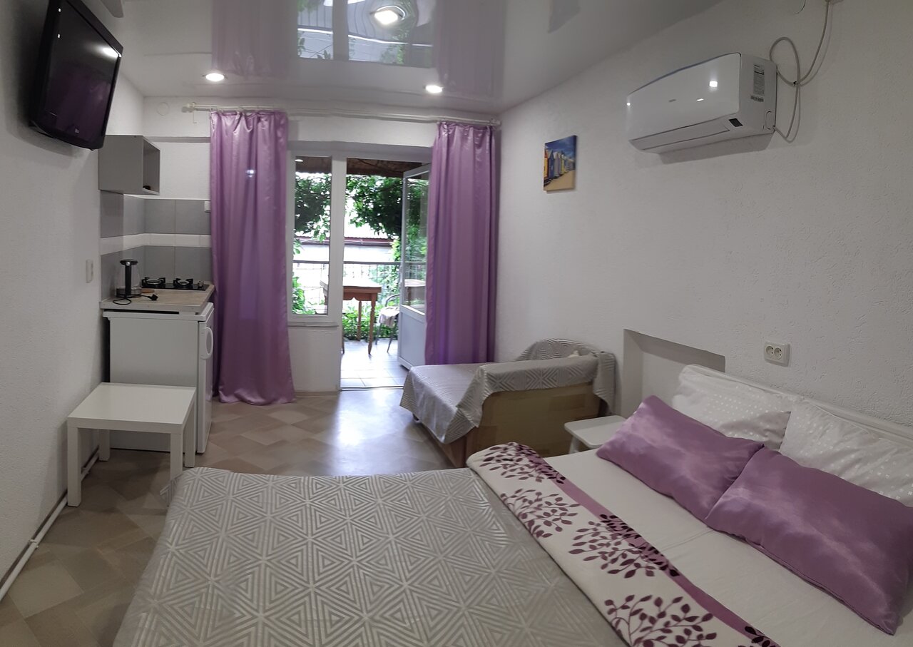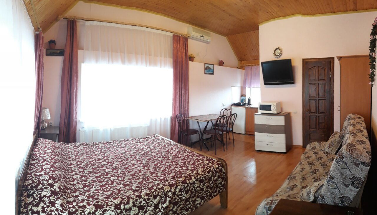 Услуги: — Номера от 1500 до 2500 ₽/ночь. — Кондиционер, холодильник, телевизор, фен, утюг, Wi-Fi. — Кухня/кухонный уголок, проживание с животными. — Бесплатная парковка, прачечная, уборка. — Трансфер, площадка для пикника. — Рядом с морем и парком.