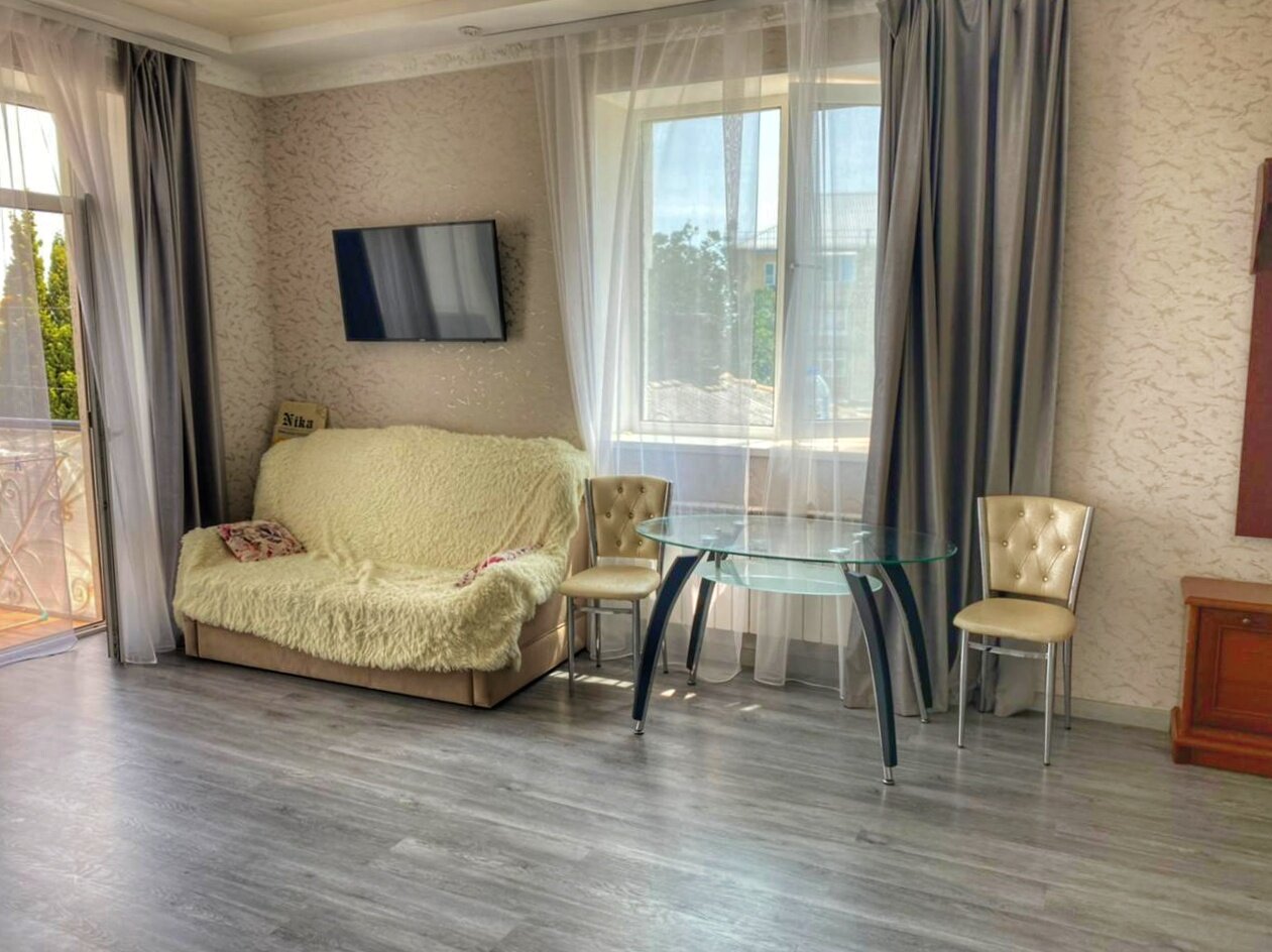 Отдыхали вначале апреля. Плюсы: чудесный вид из окна. До моря 10 минут пешком. Прекрасная прогулочная зона. В 5 минутах храм Св. Луки. Чистый номер! Минусы: при заселении некому было помочь с чемоданом поднять на 3й этаж. Я после перелома прохожу реабилитацию, мне было сложно. Полотенце в номере было на одного человека. Полотенцесушитель не работал, а на улице ещё влажный воздух и ничего не сохло. Чайник был грязный как снаружи, так и внутри. Отмывала сама. По просьбе вечером принесли вторую пару полотенец. С канализации шёл неприятный запах, хозяйка Ольга не отреагировала на просьбу устранить неполадки. Спать было невозможно, а с открытым балкомом холодно. Нет одноразовых тапочек и освежителя воздуха. Есть понятие красоты вокруг тебя и человеческий фактор.