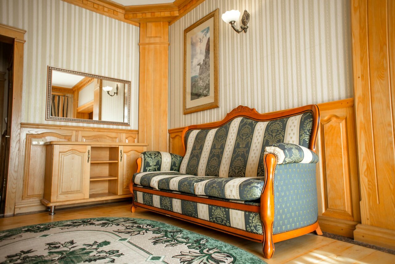 Двухуровневый люкс площадью 50 кв.м. На первом этаже – уютная гостиная с большим диваном, шкаф-купе с зеркальными дверями, телевизор, санузел. На втором этаже – спальня с двуспальной кроватью, телевизор, санузел с ванной.