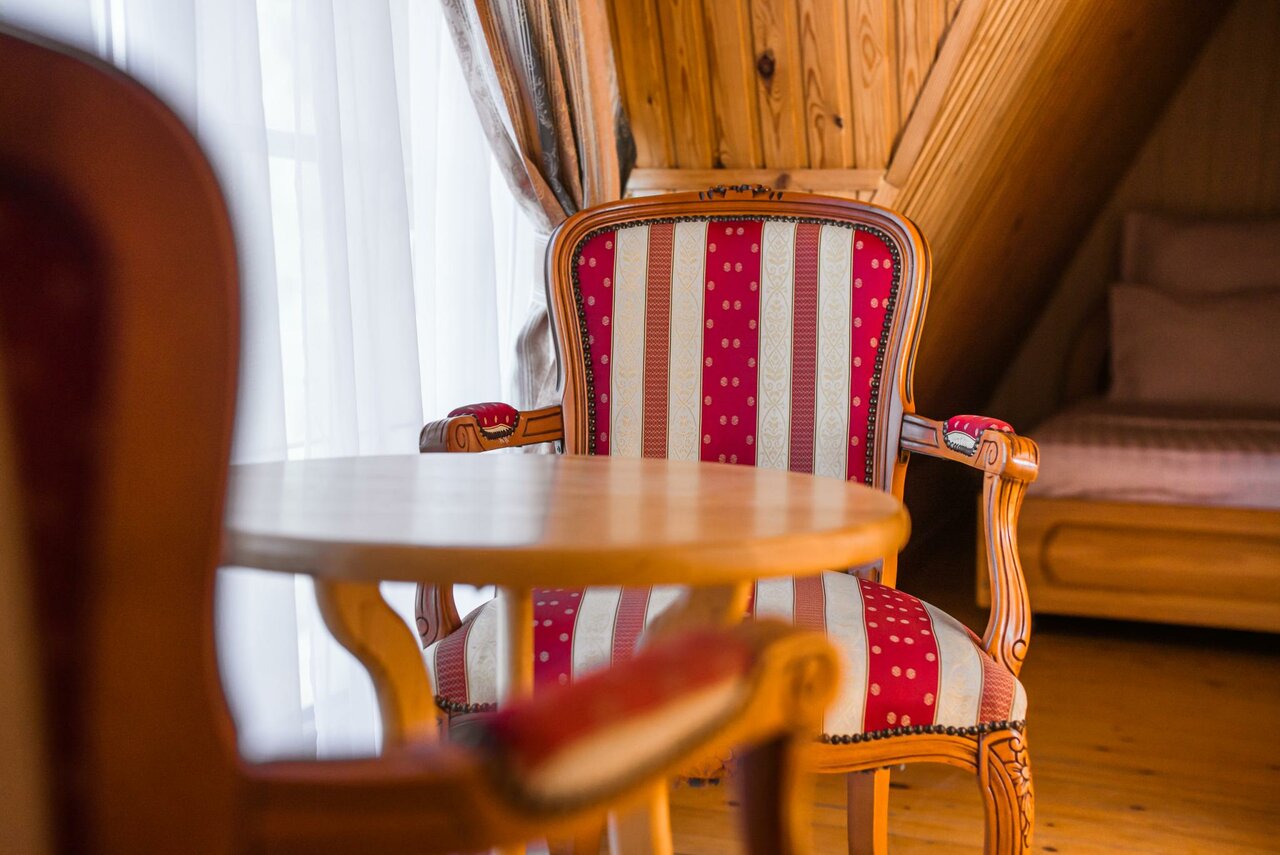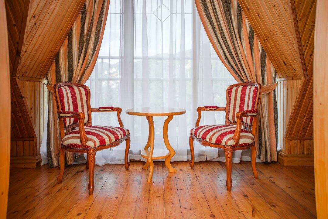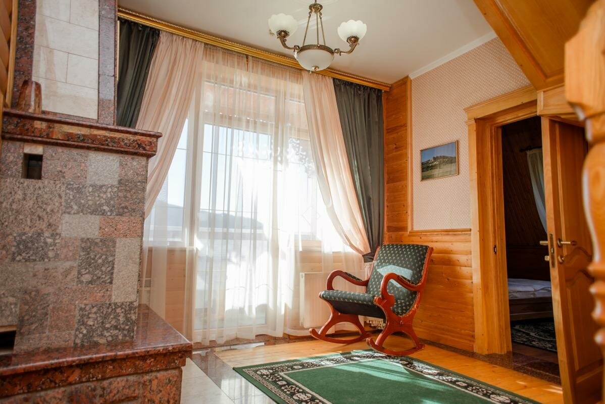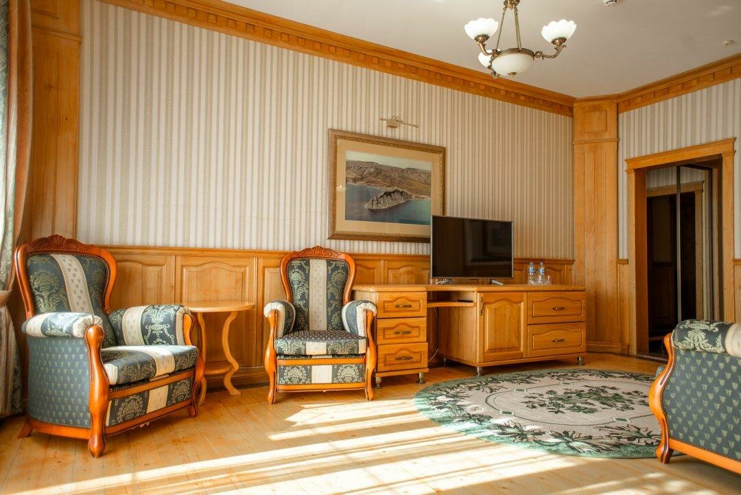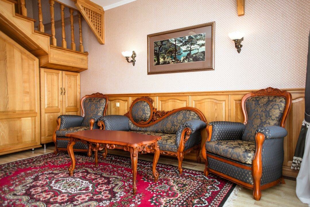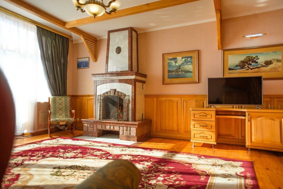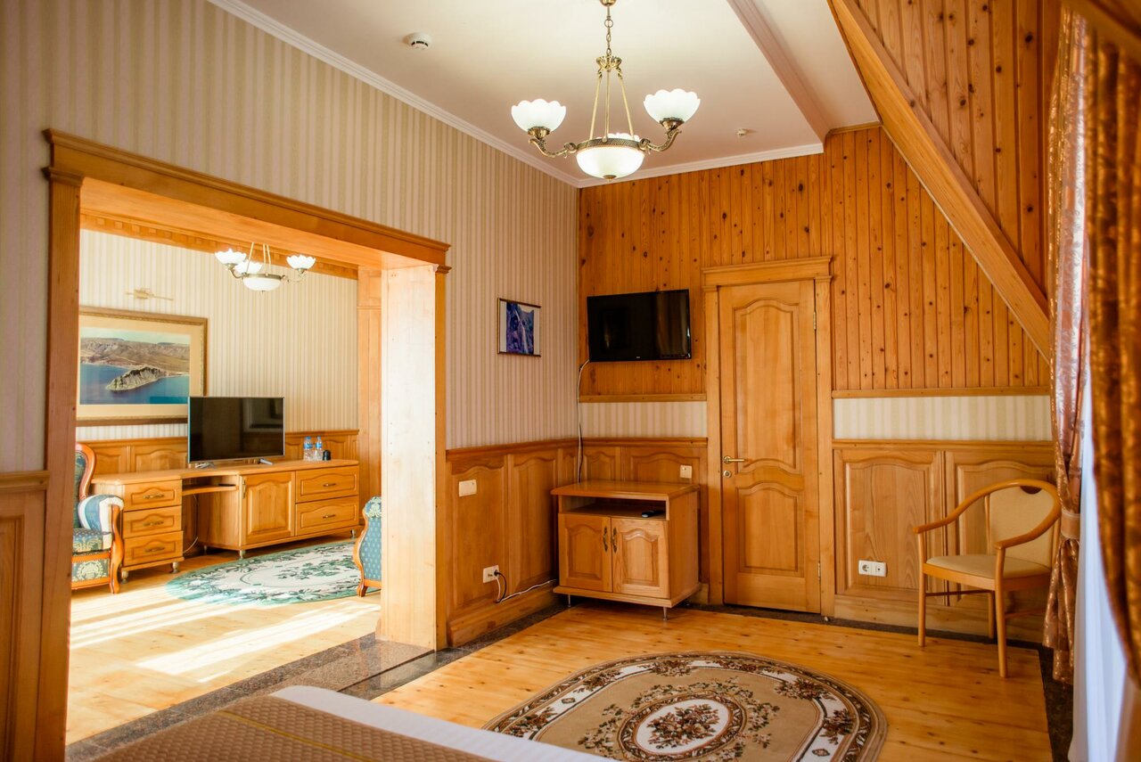 Каминный (с малой гостиной) – двухуровневый люкс с действующим камином и незабываемым видом на море. На первом этаже – небольшая гостиная с мебелью в классическом стиле, камином, спальней и гостевым санузлом. На втором – ванная комната, тв и диван.