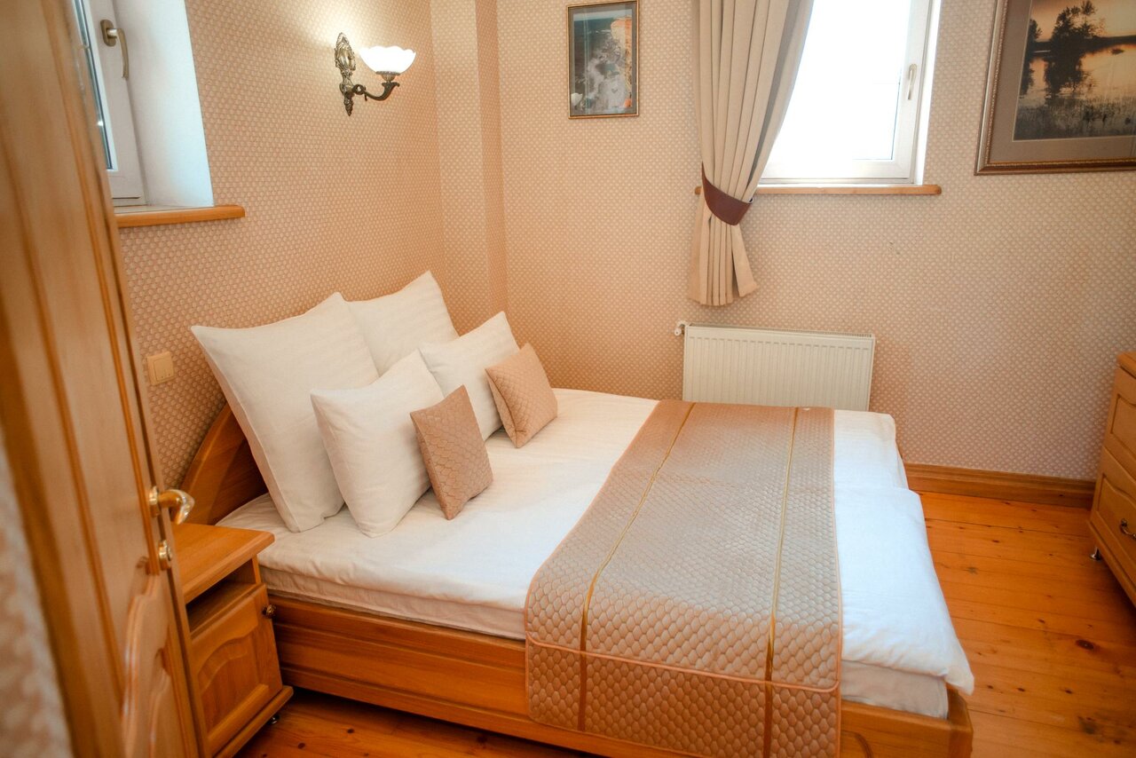 Понравилось: 1. Красивые номера 2. Шикарный внутренний парк. Не понравилось: 1. Периодическое отсутствие горячей воды 2. Нет возможности попить вечером чай (нет ни чайников в номерах ни куллеров в коридорах, ресторан работает до 22-00). 3. Ресторан одно только название еда как в столовой, больше походит на домашнию кухню что-то удалось а что-то (как например салат Цезарь просто ужас). 4. Нет своей парковки машины ставят по принципу кто раньше встал.