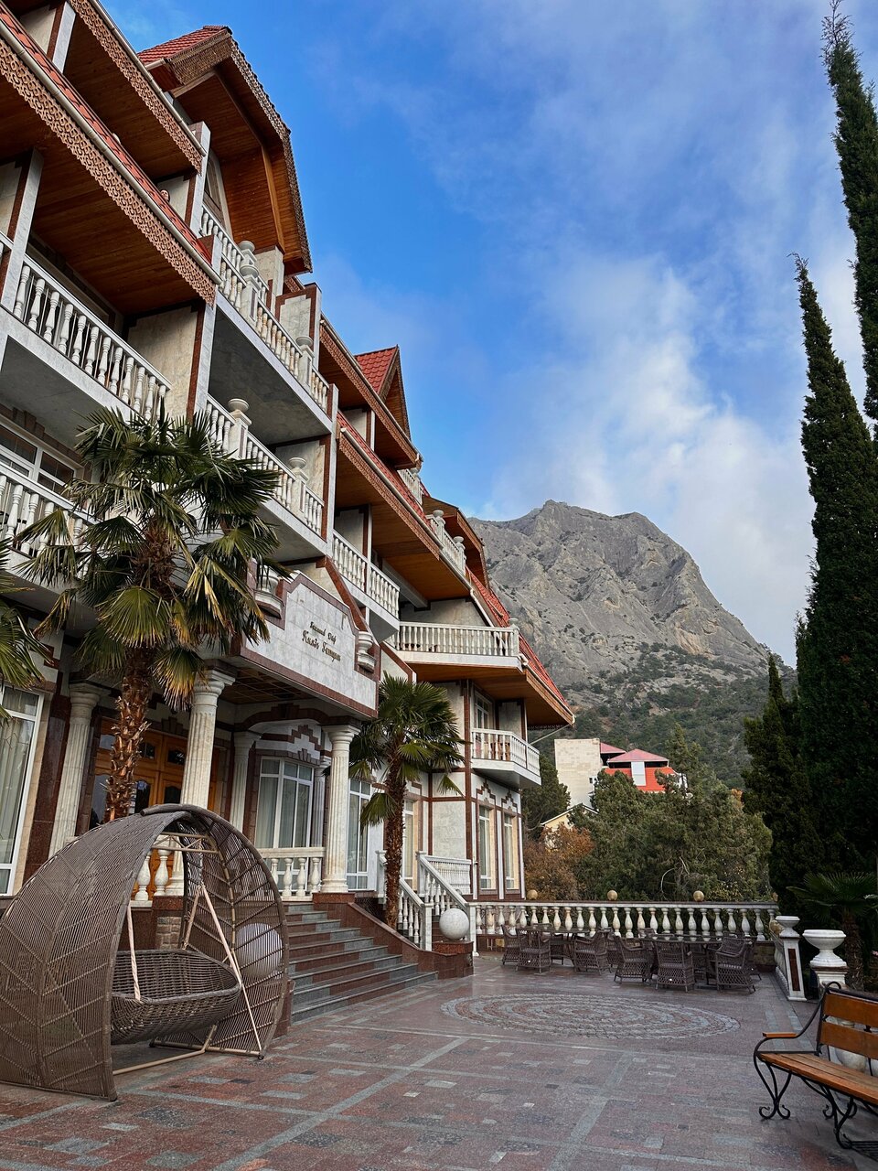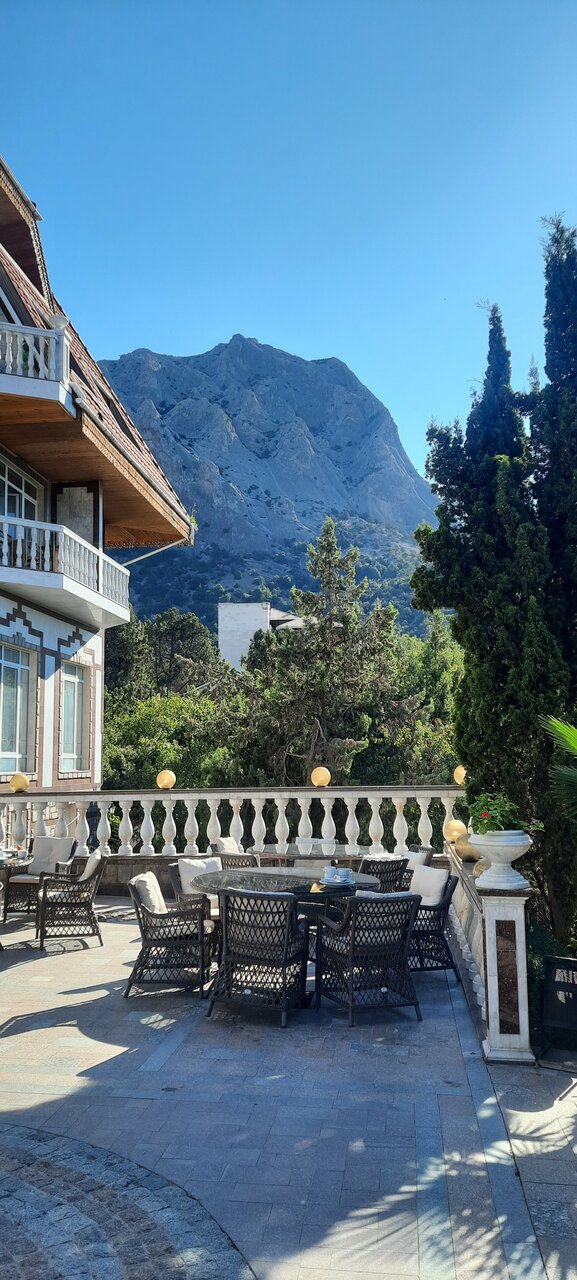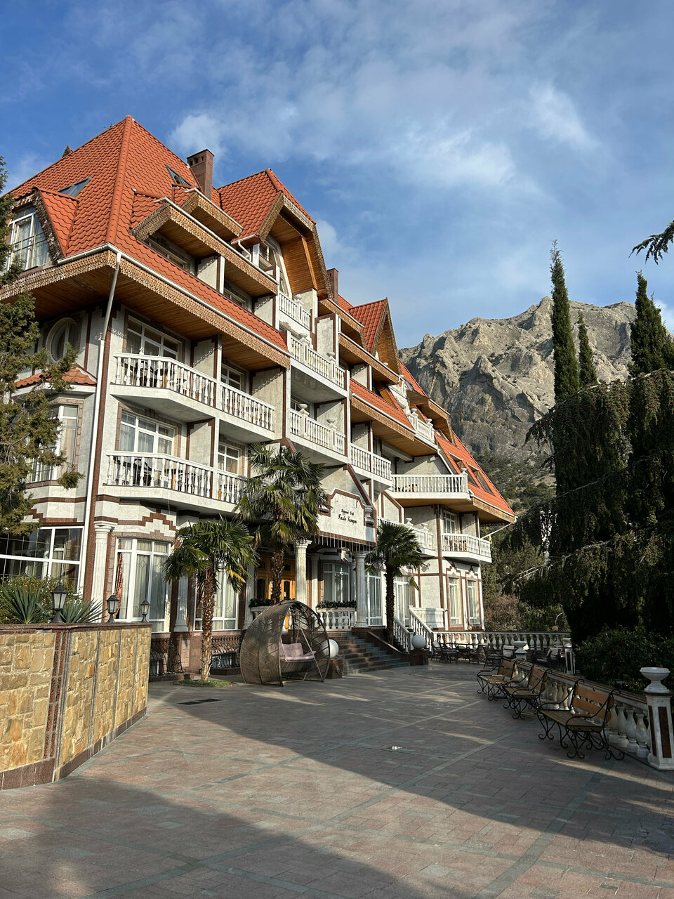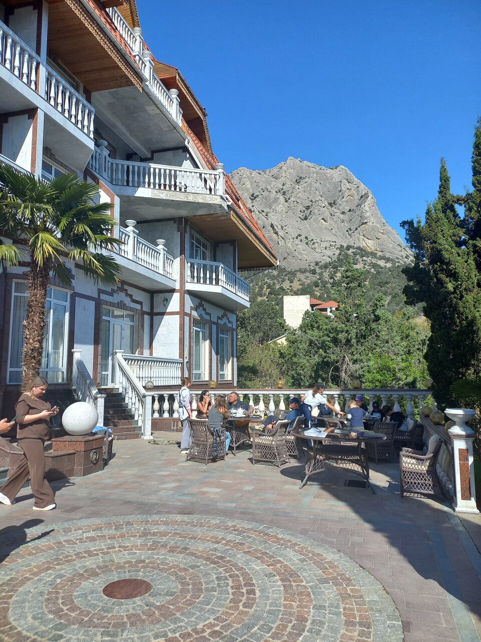Потрясающее расположение, вид из номера изумительный. Просторный чистый номер (улучшенный), отделка натуральным деревом придает свой шарм)) кровати большие, белье/полотенца/халаты безупречны. Территория супер, ухоженно, красиво. Беседки за отдельную плату. Завтраки на троечку, но вполне съедобно. Персонал вежлив и обходителен. Общее впечатление хорошее, переночевать вполне можно. Приезжали в не сезон на тропу Голицына. Никаких развлечений, кроме посещения заповедника, тропы Голицына и завода Новый Свет нет.