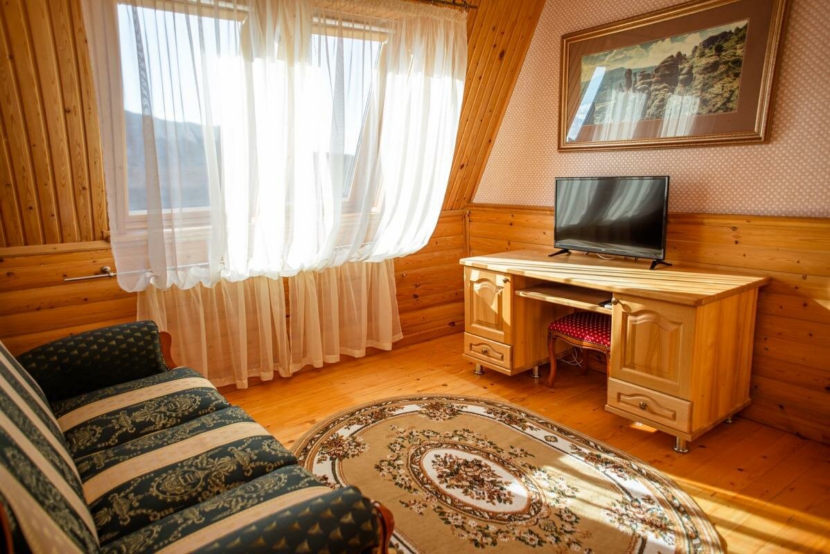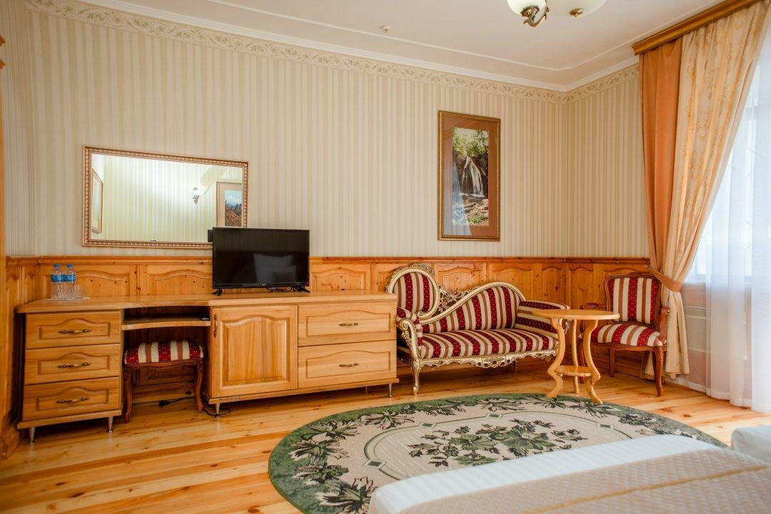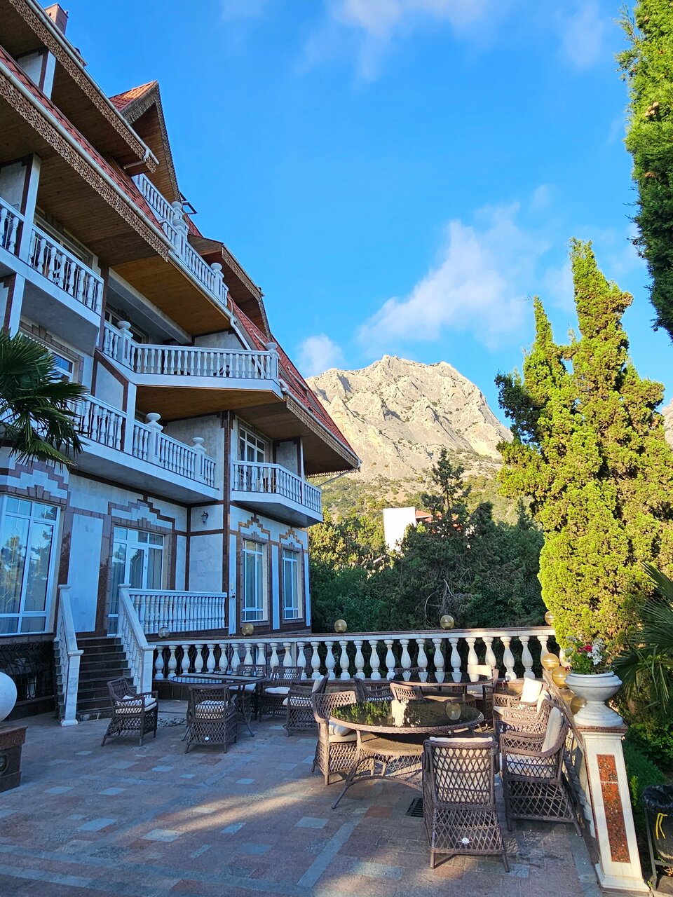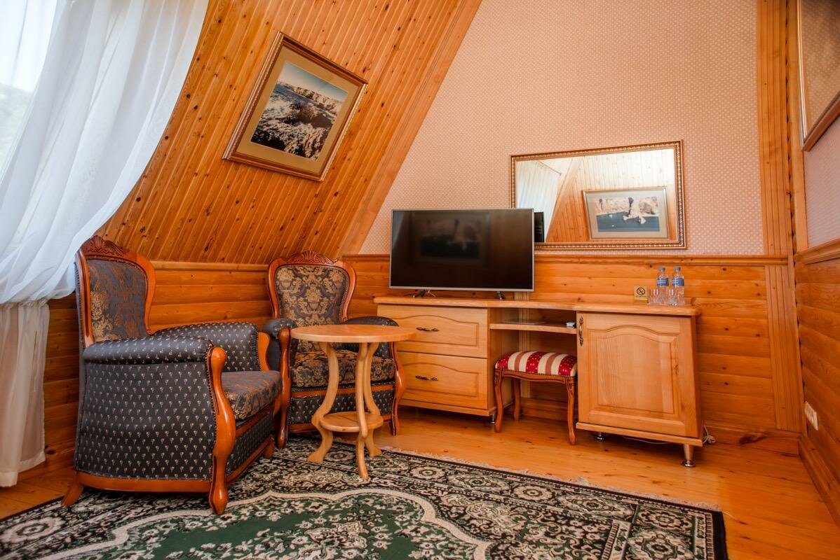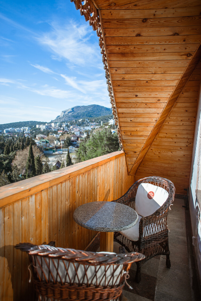 Потрясающее расположение, вид из номера изумительный. Просторный чистый номер (улучшенный), отделка натуральным деревом придает свой шарм)) кровати большие, белье/полотенца/халаты безупречны. Территория супер, ухоженно, красиво. Беседки за отдельную плату. Завтраки на троечку, но вполне съедобно. Персонал вежлив и обходителен. Общее впечатление хорошее, переночевать вполне можно. Приезжали в не сезон на тропу Голицына. Никаких развлечений, кроме посещения заповедника, тропы Голицына и завода Новый Свет нет.