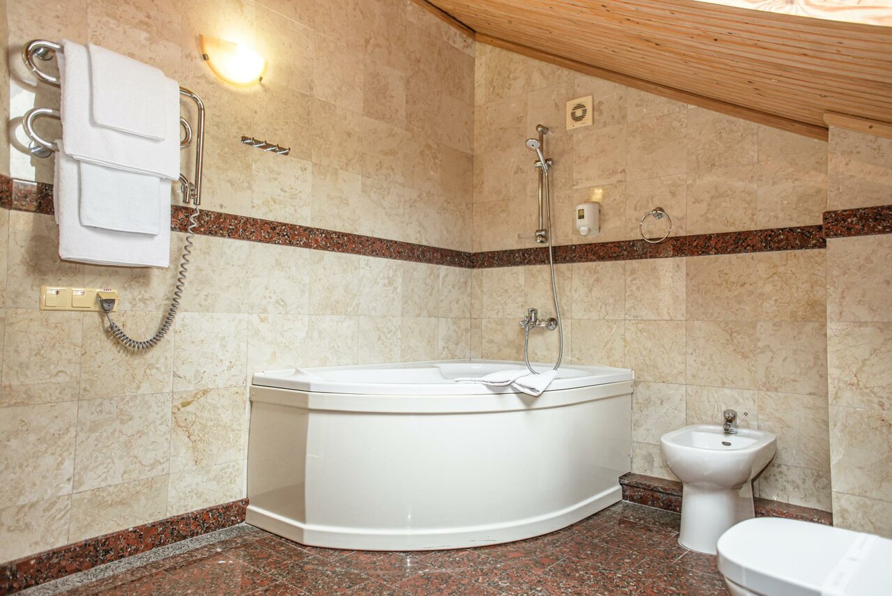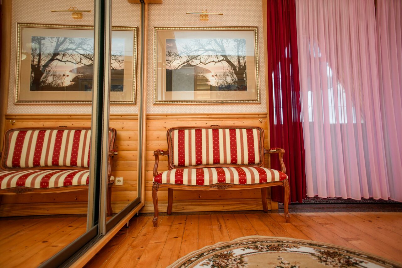 Двухуровневый люкс с действующим камином и незабываемым видом на море площадью 52 кв м. На первом этаже – просторная гостиная с мебелью в классическом стиле и камином, гостевой санузел. На втором – уютная спальня с двуспальной кроватью, ванная.