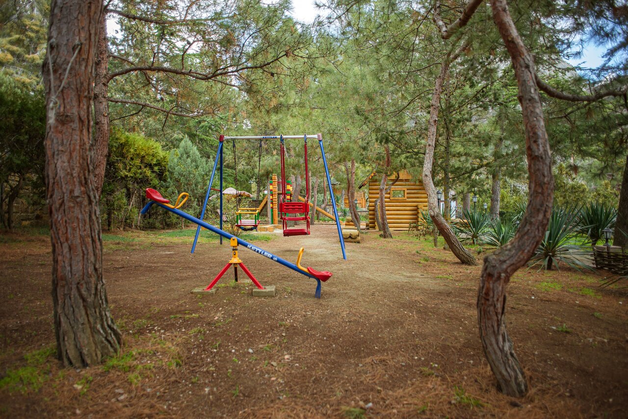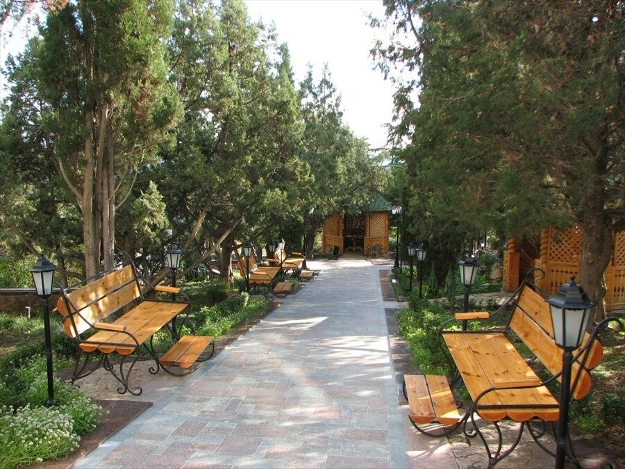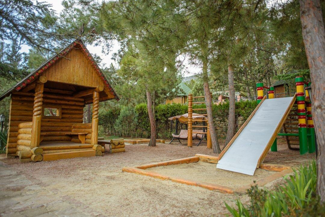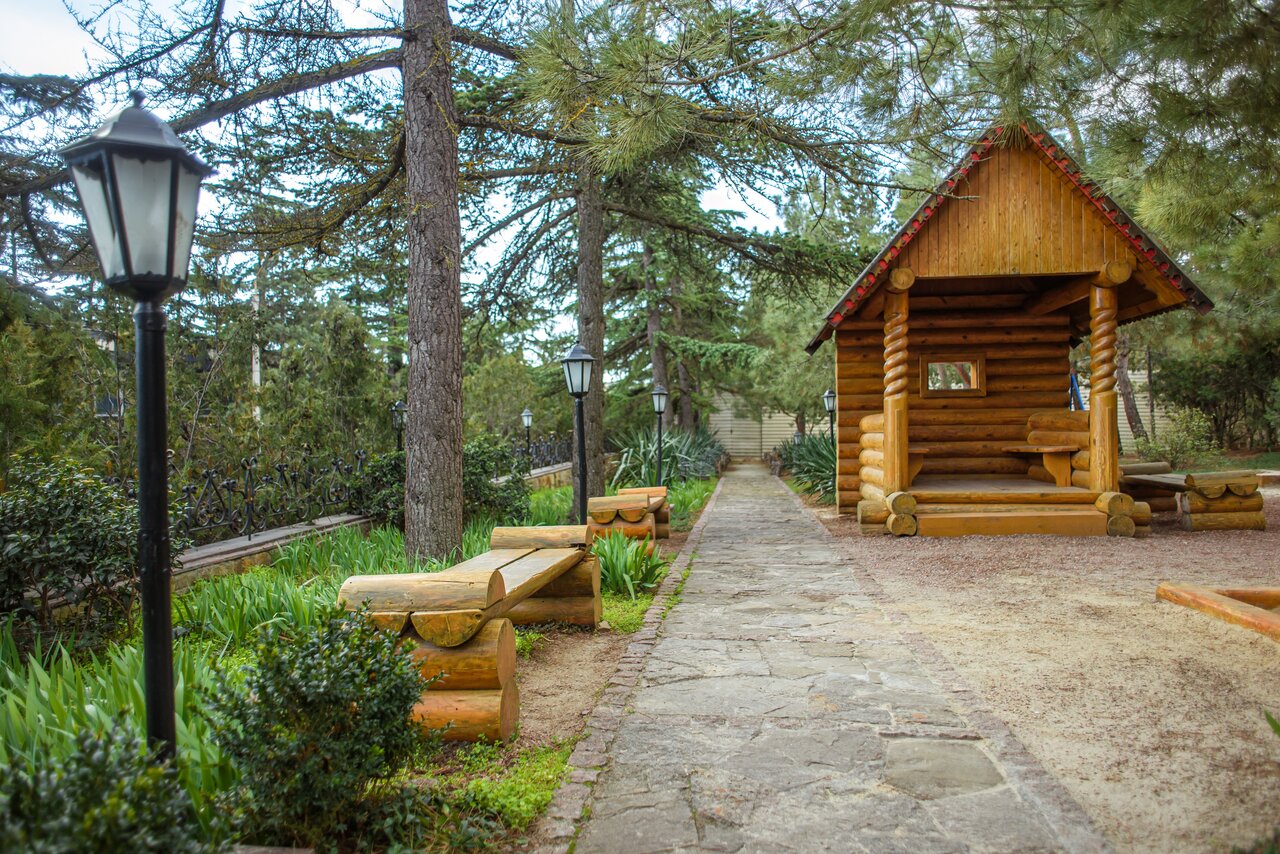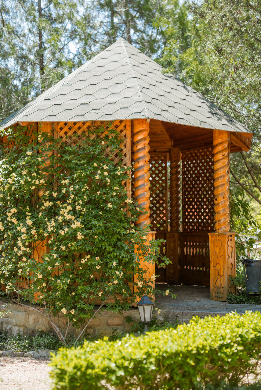 Беседка расположена в удобном месте парка отеля. Она оборудована универсальным мангалом. Гостям предлагаются все необходимые аксессуары для приготовления блюд (уголь, дрова из лиственных пород деревьев, шампуры, решетки, необходимая посуда).