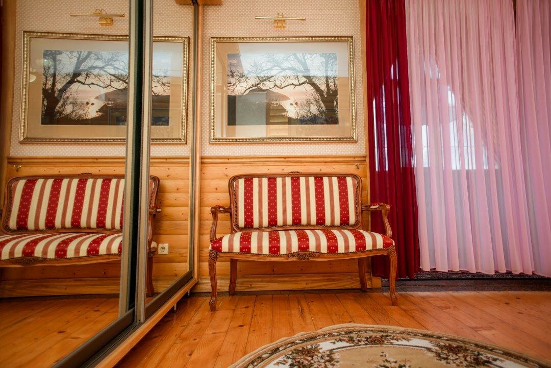 Двухкомнатный уютный номер улучшенной планировки с видом на море. Комнаты разделены арочным входом. В первой комнате расположены две полуторные кровати, журнальный столик, софа, комод, телевизор.Вторая комната двумя одноместными кроватями.