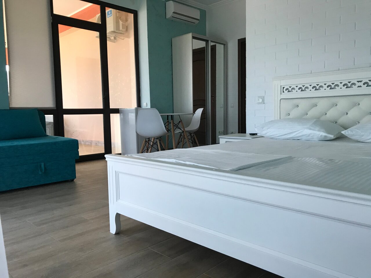 Современный, просторный и уютный номер с видом на море и горы. В номере оборудованная кухня, система кондиционирования. Удобная кровать, раскладывающийся диван. Большой балкон с комфортабельными креслами и диваном.