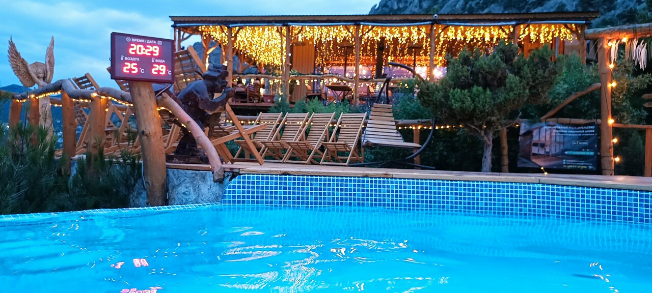 Там очень круто!Ходим туда в основном зимой. Классный открытый бассейн и джакузи. В каждой баньке парилка и душ и караоке .Великолепный вид на море и Новый свет. От воспоминаний дух захватывает !Очень рекомендую!