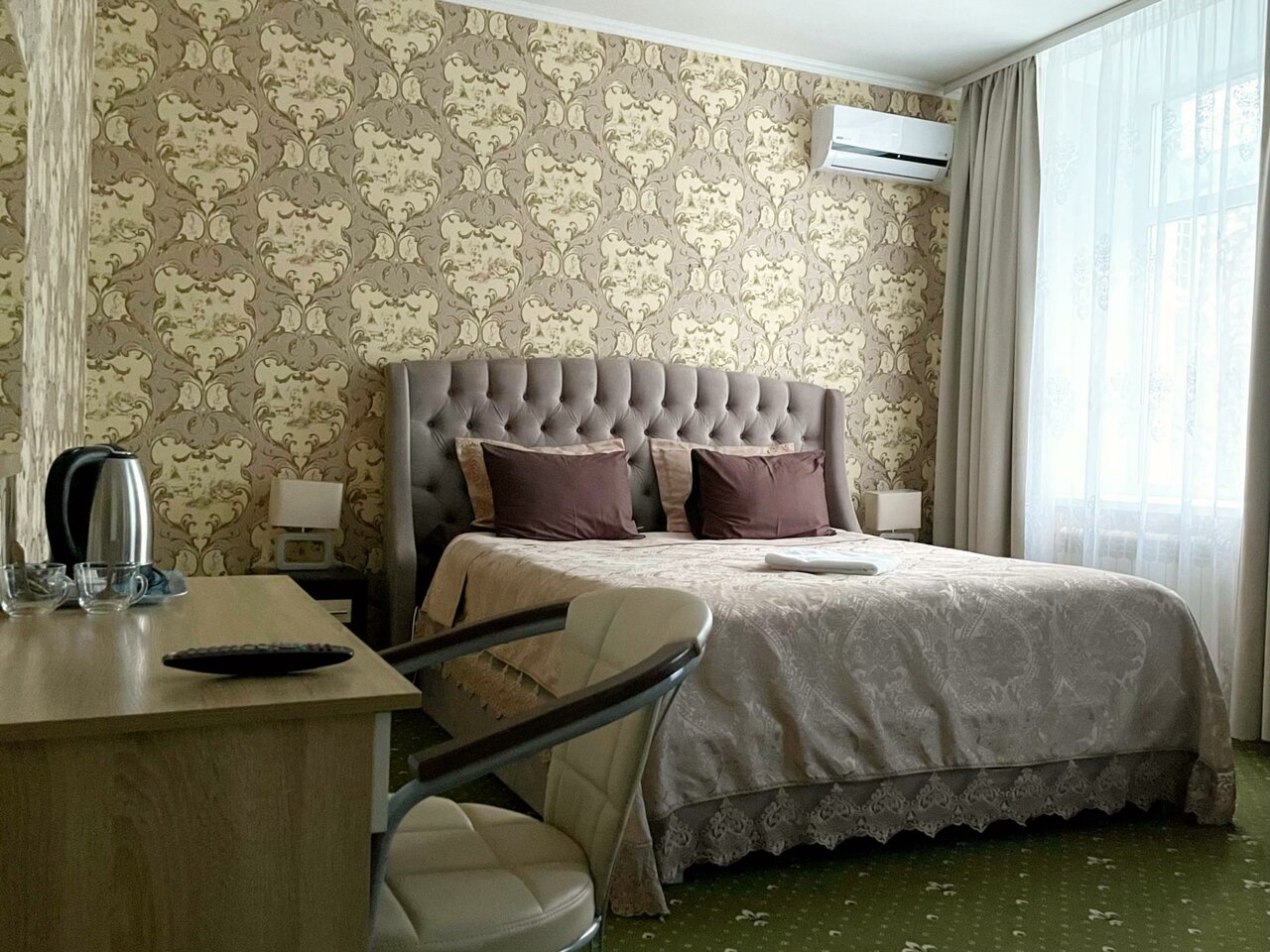 Этот однокомнатный номер общей площадью 21 кв.м. имеет одну просторную двуспальную кровать (размер 180х200 см). В номере два кресла, столик, телевизор, телефон, банные и туалетные принадлежности, фен, бесплатный WiFi. Номера категории Люкс оснащены в