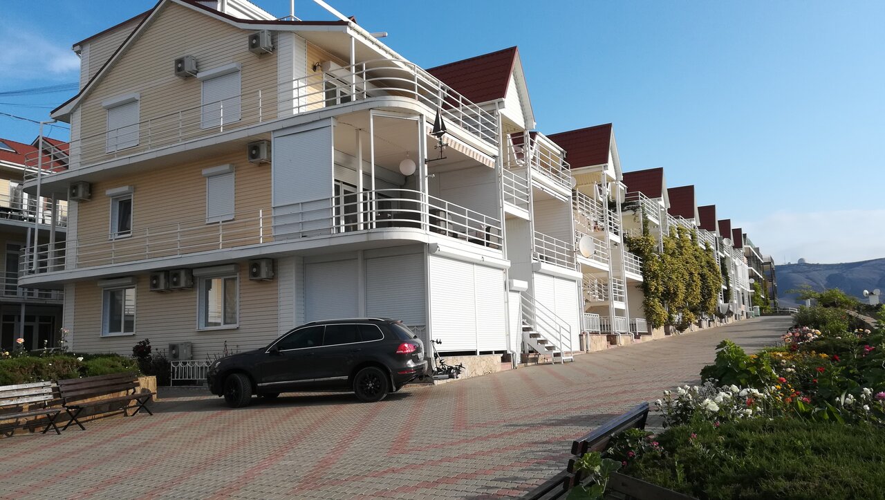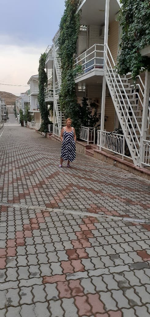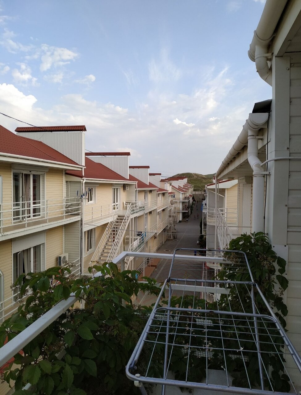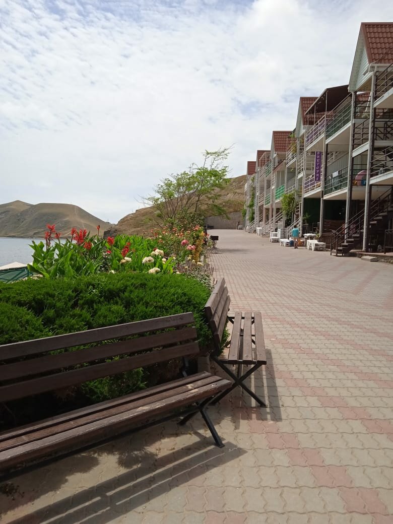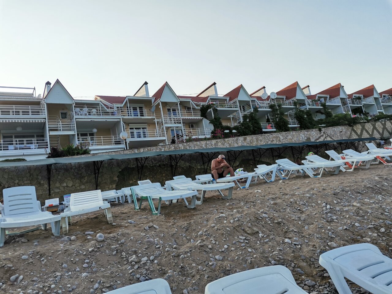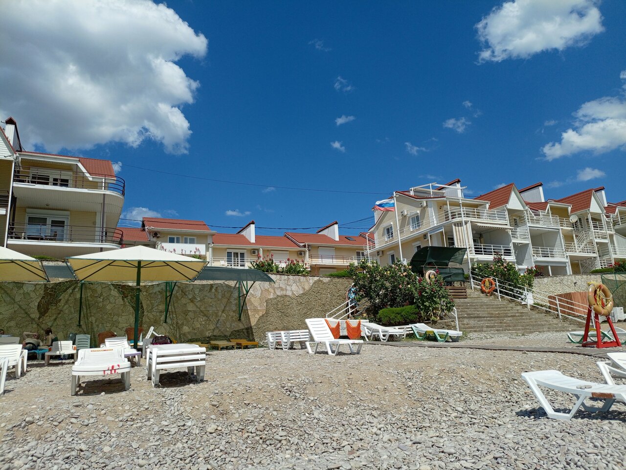 Хорошая территория, все в брусчатке, дети на самокатах могут гонять. 2 магазина и 2 кафе, хороший пляж, предоставляют бесплатно шезлонги, вход в море сначала не большая галька, потом песок. цена за номер все таки завышена
