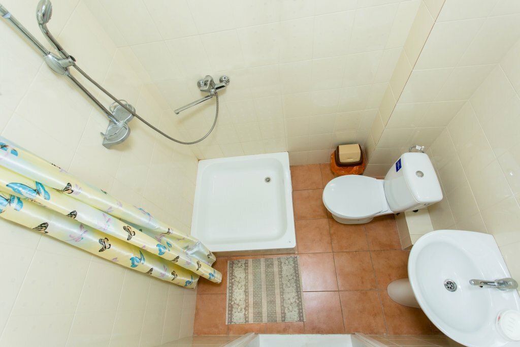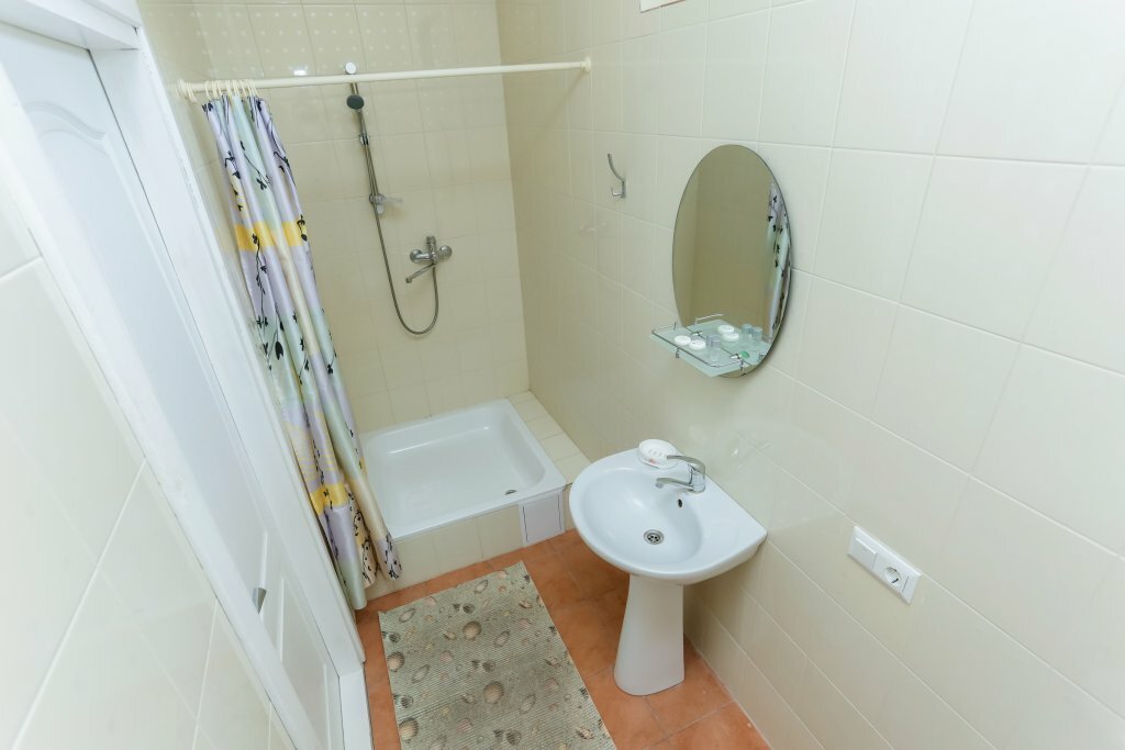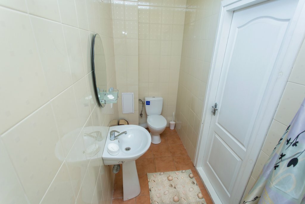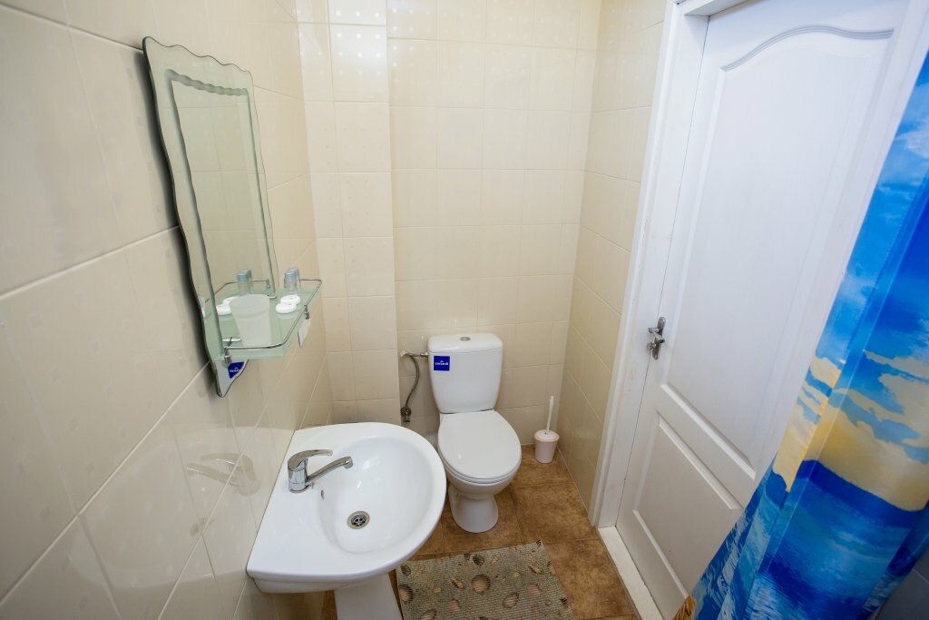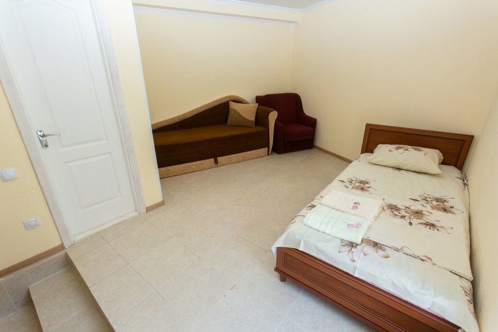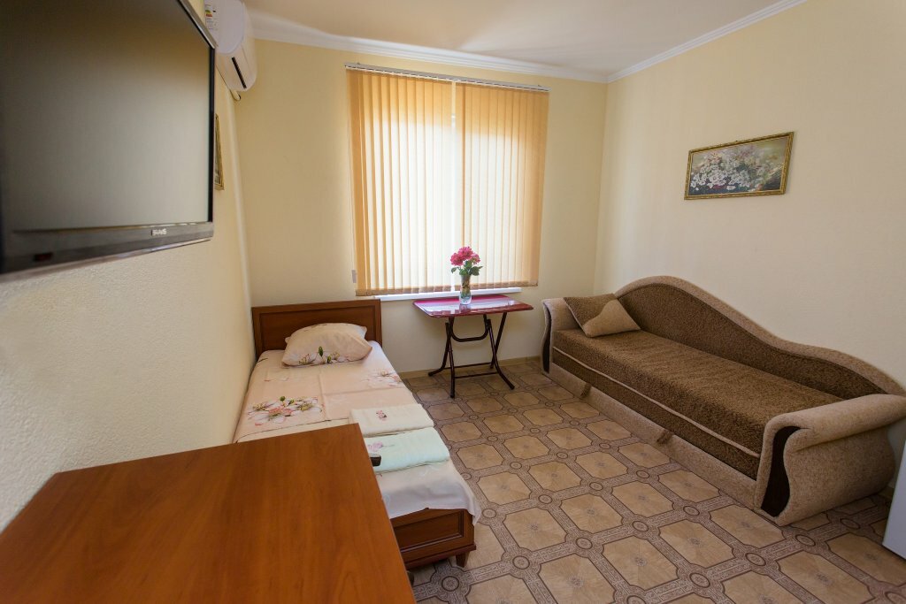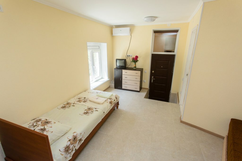 Маленький отель, очень чисто, 3 этажа. На первом этаже кухня, прохладный внутренний двор — террасса. Номера небольшие, но в каждом есть свой санузел с душем, кондиционер, холодильник, телевизор (что далеко не везде встретишь в Крыму в отельчиках той же категории)