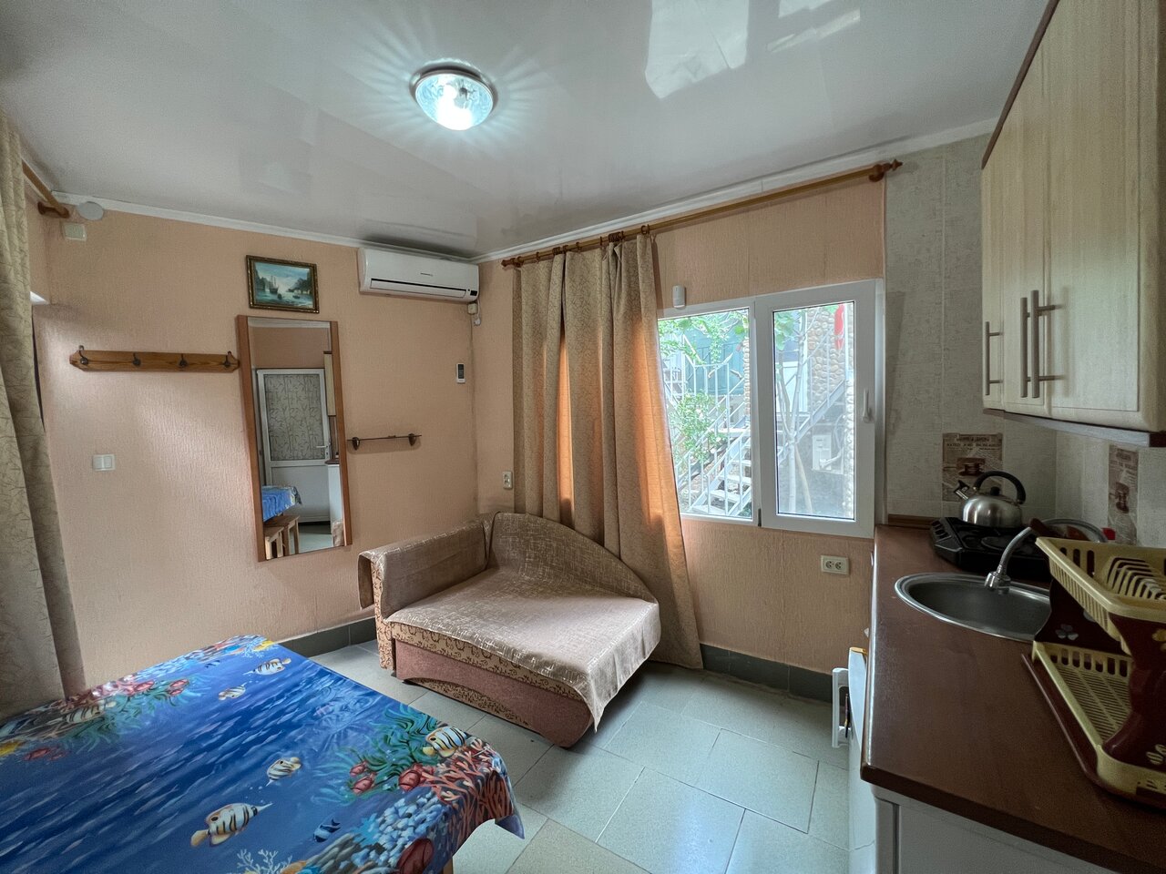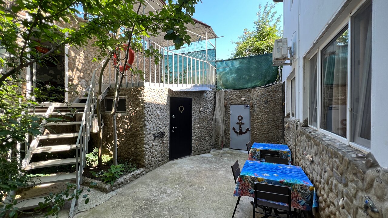 Отдыхали двумя семьями в июне этого 2021 года. Очень интересно оформленный гостевой дом. Достаточно места для сушки белья, отличная зона отдыха на третьем этаже. До моря недалеко, пляжи чистые. Мы жили на первом этаже. Оба номера были больше похоже на подвал, чем каюты. Очень сыро в номерах, это портит всю классную задумку с кораблем. Всё что попадало в номер сухим моментально становилось влажным, неприятное ощущение. Совет гостям — ни в коем случае не берите первый этаж. Выше видимо будет лучше. Постельное белье, подушки желают оставлять лучшего. Очень жалею что не сфотографировала внутреннее убранство номера, он явно требует обновления. Хозяина гостеприимным назвать сложно если честно) Как сказал наш сосед бывают номера и хужеЭто так, но бывают и лучше