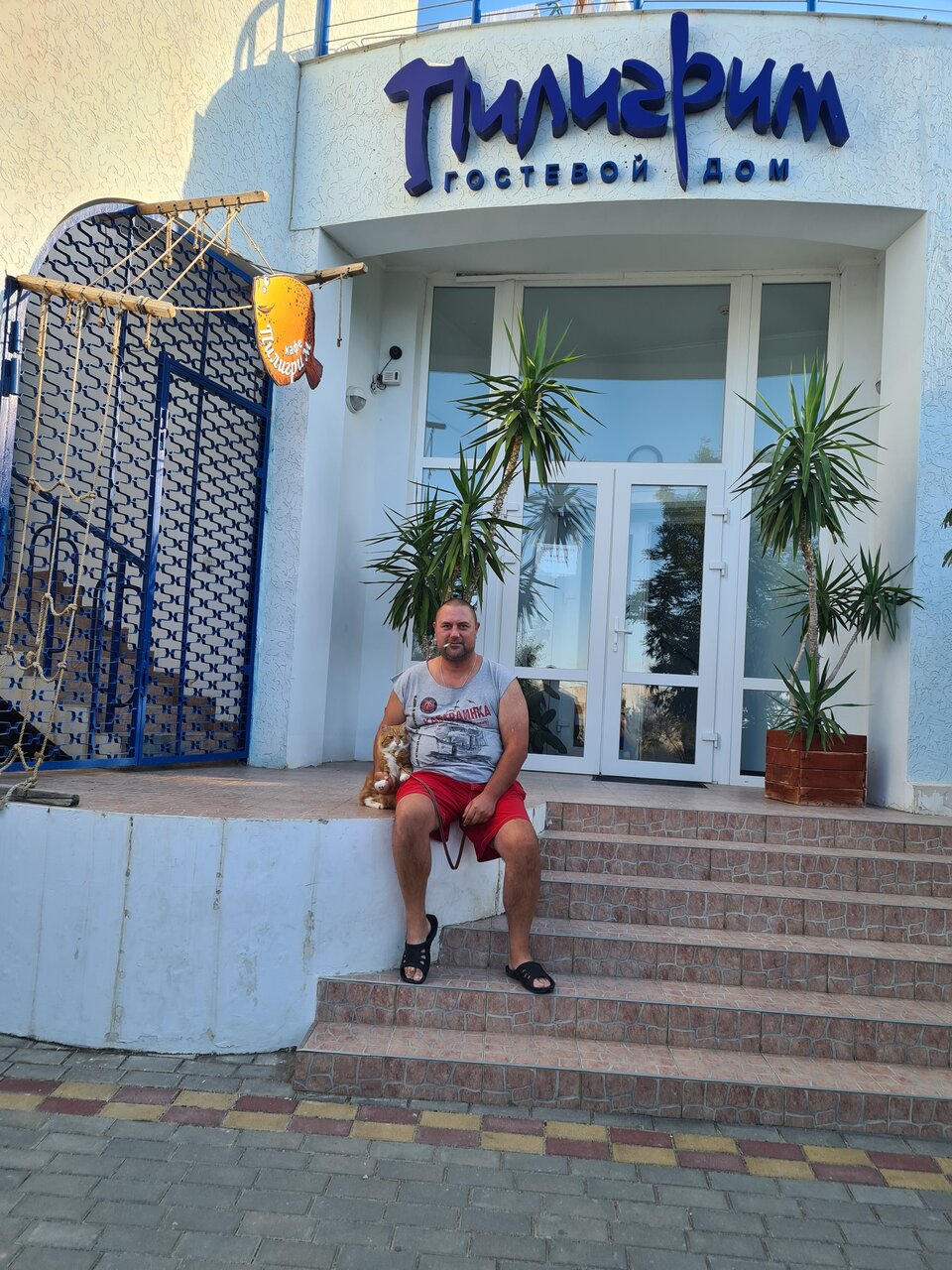 Отличное кафе — прекрасный вид с веранды, приятный интерьер, вежливый и доброжелательный персонал, есть туалет (что немаловажно) и wi-fi….в жаркий день на веранде тенёчек и ветерочек) Из еды всё вкусно, большой выбор блюд из разных категорий и вкусное крафтовое крымское пиво. Пробовали и супы и салаты и черноморскую рыбу и десерты, кофе — всё отлично, часто заходим сюда. Чуть ниже по набережной есть кафе Сытая Пристань, это, как я понимаю, младшая сестра Пилигримма) Там немного другое меню, оно более домашнее чтоли, но такая же уютная атмосфера в более закрытой веранде с прекрасным видом. Да, и практически всегда прекрасный музыкальный фон.