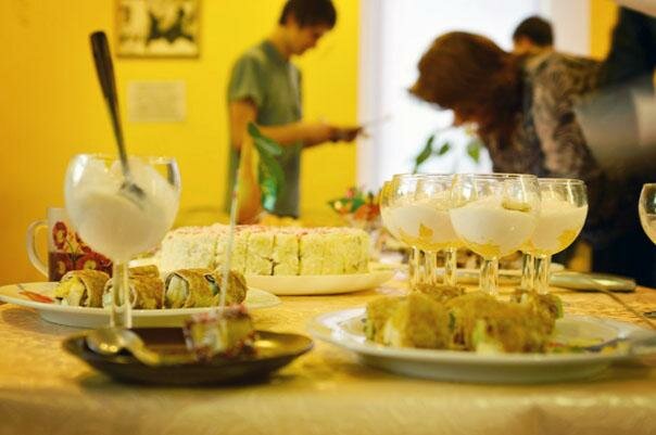 Общая душевая кабина и туалет. Кухни нет, но можно воспользоваться чайником, холодильником и микроволновкой.
