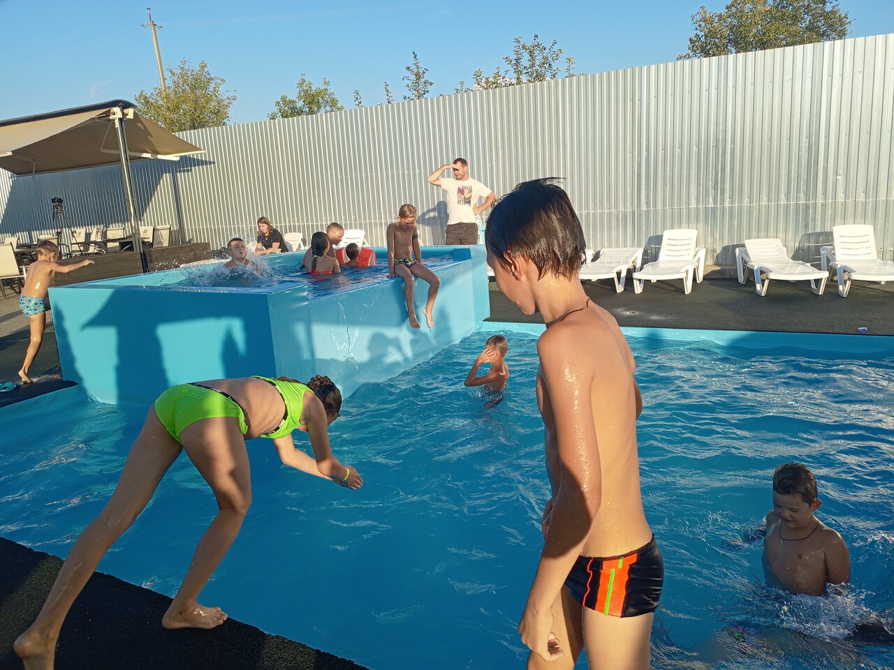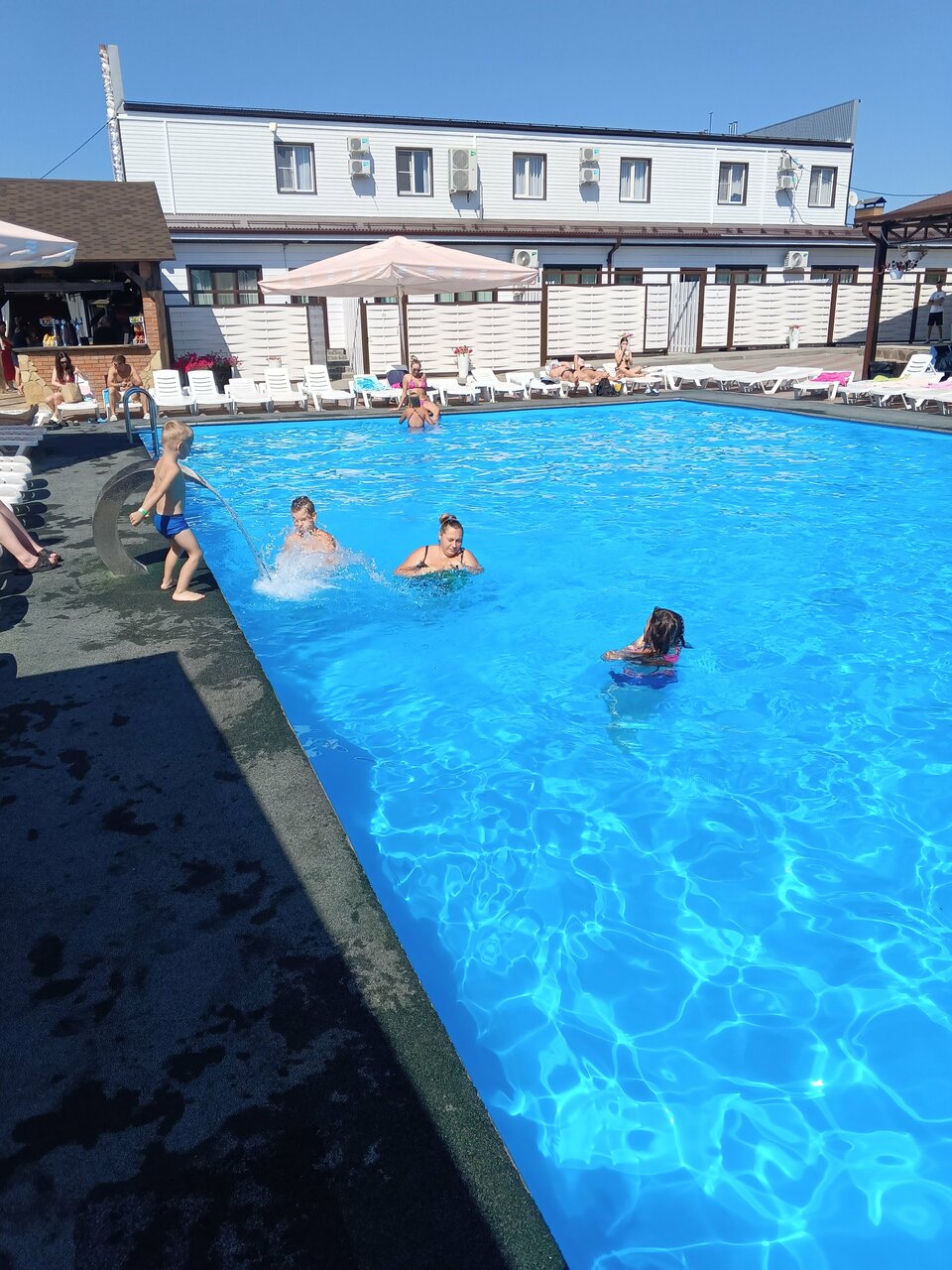 Хорошее место. 2 бассейна детский и взрослый. Есть небольшая банька, вернее парилка. Раздевплки, туалет, душ, лежаки, отзывчивые и милые работники. Чисто, опрятно и уютно. Минусы: 1Лежаки всё на солнце, тенечка нет. 2Кухня плохая. ( заказывали пицу и картошку фри. Ждали долго. Дети пике есть не смогли т к она была очень острая. По обещанию администратора что есть молочные каши, супы… Нам отказали в их приготовлении, объяснив тем что у них сейчас какой то большой педзакпз и им некогда с этим возиться. 3 Надувная горка. Она сдувается. Дети толпой спускаются. Так и смотри что большие задавят маленьких.