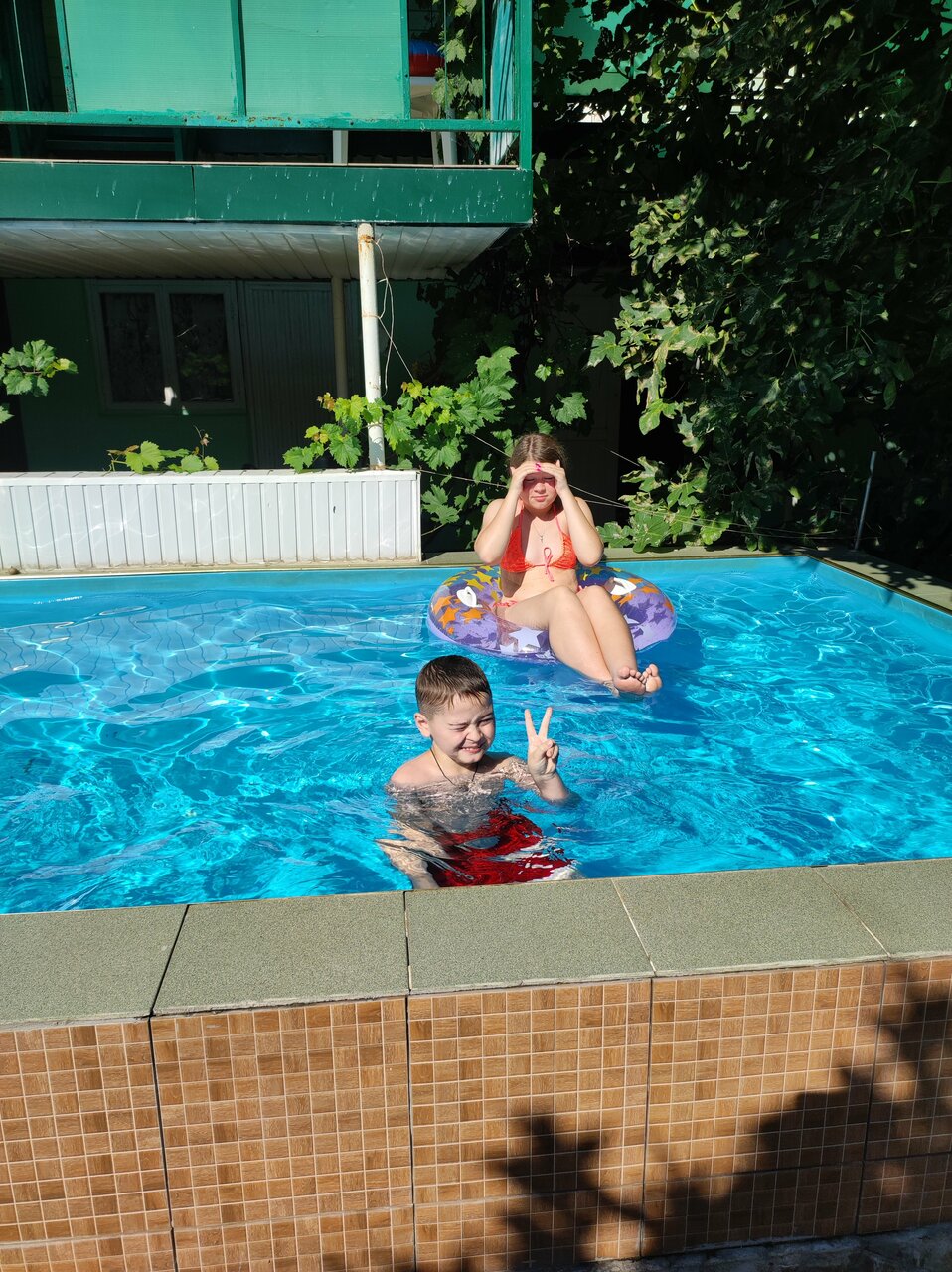 Отдыхали с детьми. Нам очень понравилось. Номер был простой, но уютный. Номера расположенны так, что отдыхающие не мешают друг другу. У нас было свое место на улице , где можно покушать и посидеть вечером. В номере был свой холодильник, телевизор и кондиционер. Дмитрий и Оксана очень приветливые. Бассейн выручал, когда на море была холодная вода или сильный шторм. Бассейн чистый. Напротив можно было заказать шашлык, хотя на территории есть мангал. В сильную жару можно укрыться под тенью инжира, груш и яблонь. Воздух чистый. Шум с трассы не доносится .Да, и еще нас угощали вкусными яблоками.