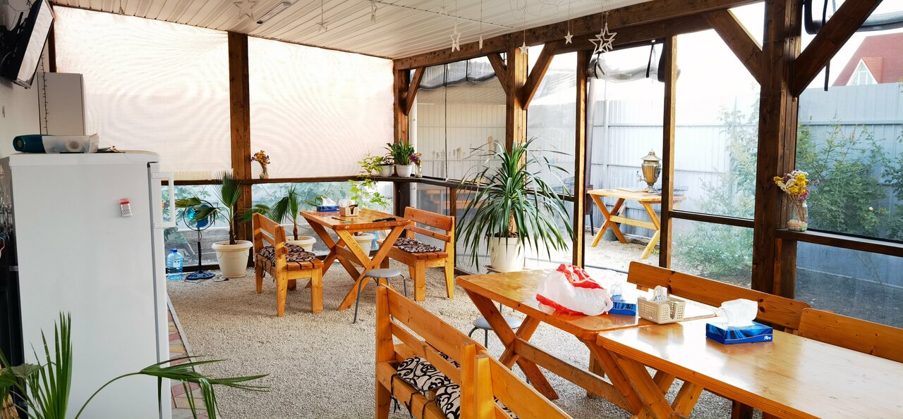 Удобства: — Номера с кондиционером, Wi-Fi, ТВ, холодильником, санузлом; — Сезонный бассейн, сауна, баня, детский бассейн, настольный теннис; — Летняя веранда, терраса, общая кухня, бесплатная парковка; — Проживание с животными (платно), детские кровати (бесплатно); — Трансфер (платный), ускоренная регистрация.