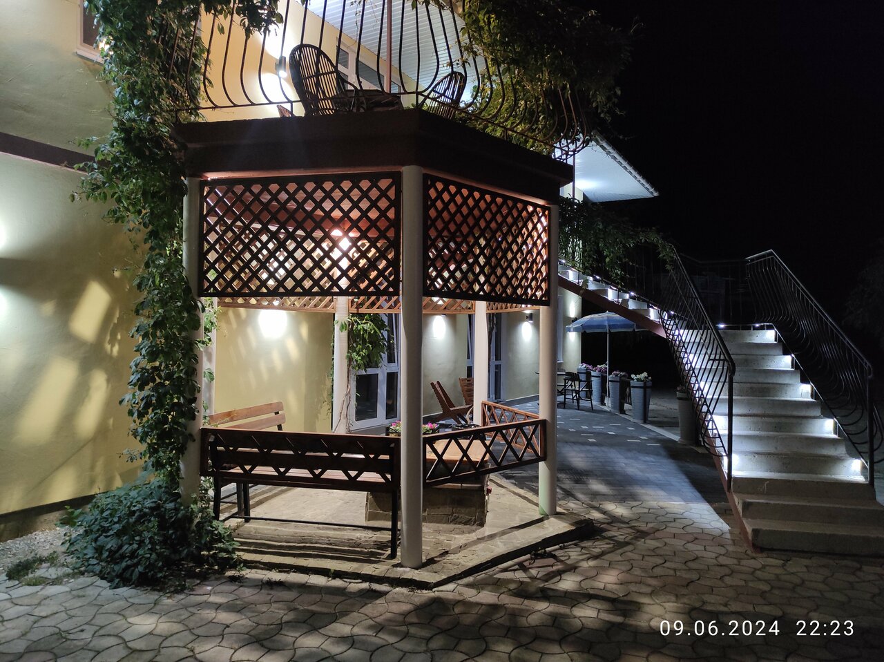 - Красиво оформленный двор, вечерняя подсветка.