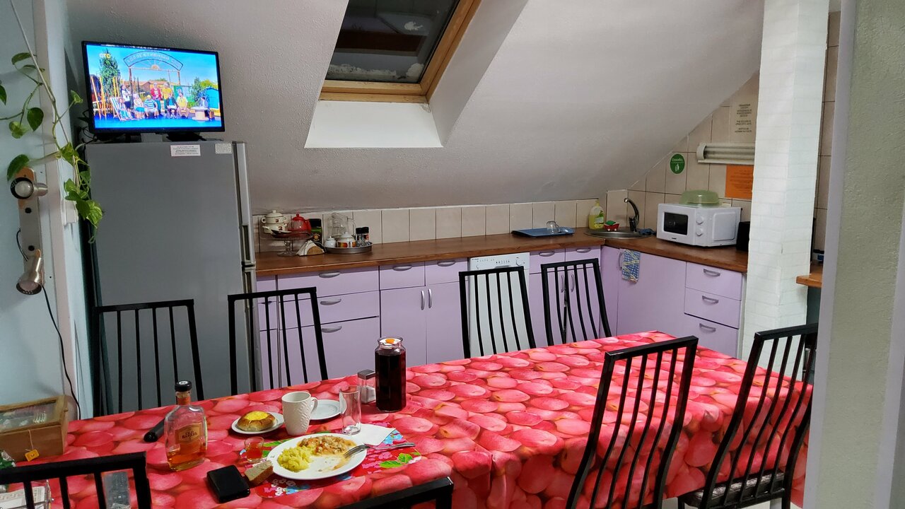 Неплохая гостиница, хочу отметить из плюсов это завтраки которые включены в стоимость номера. Полноценный завтрак: каша ( большая порция), вареное яйцо, хлеб, масло, заварной кофе или чай по желанию, варенье. Т.е. вполне и вкусно и сытно. Из минусов — мансардный этаж, очень большая слышимость. Также есть кухня на которой нам почему то не разрешили готовить, хотя все для этого есть. Есть индукционная плита, но кастрюли и сковороды убраны. Предложили воспользоваться своими, нам запретили, сказали можно только разогреть. И ещё, других гостиниц сдесь нет.