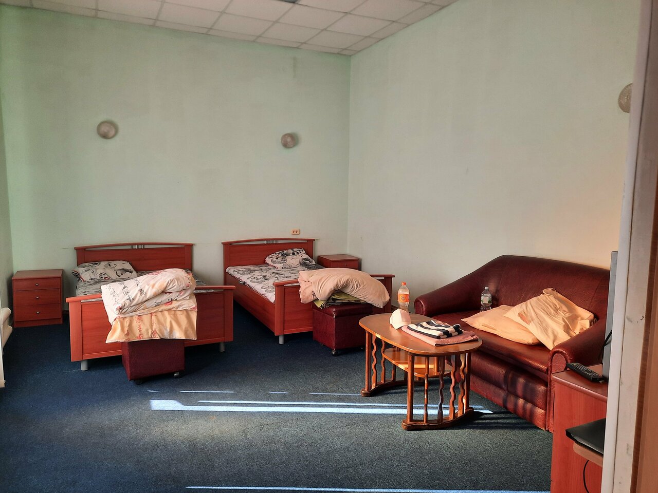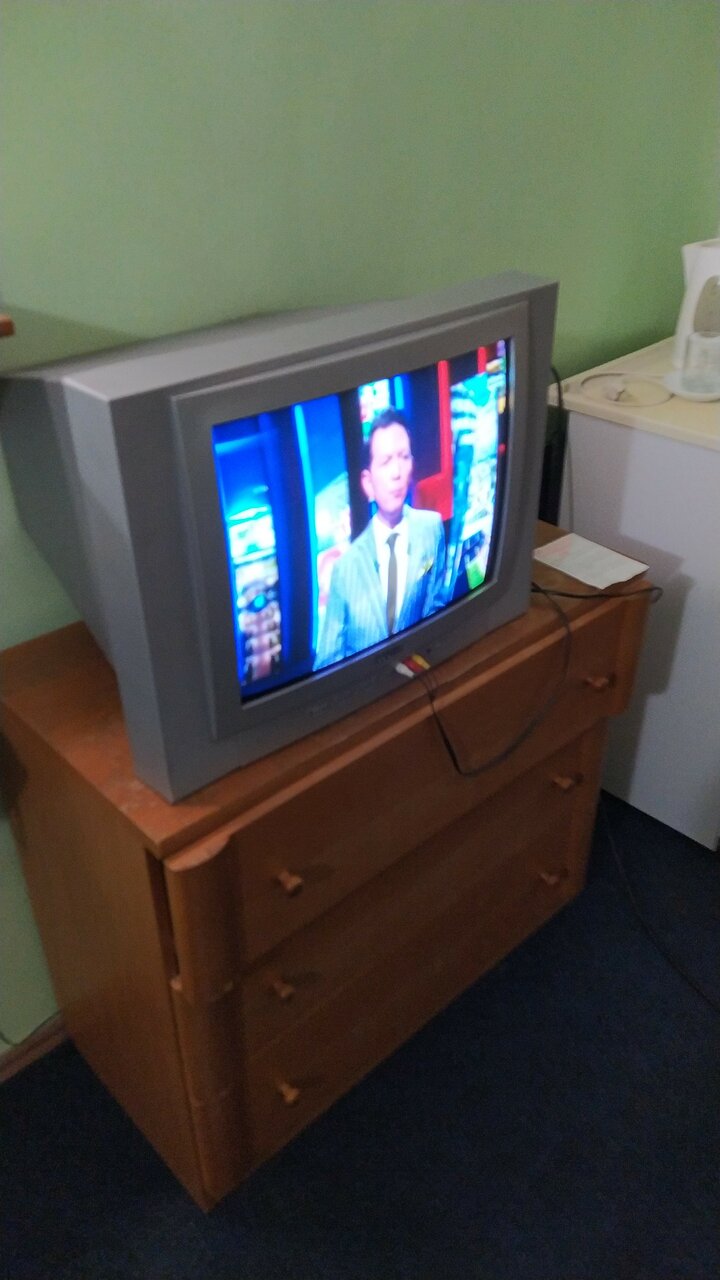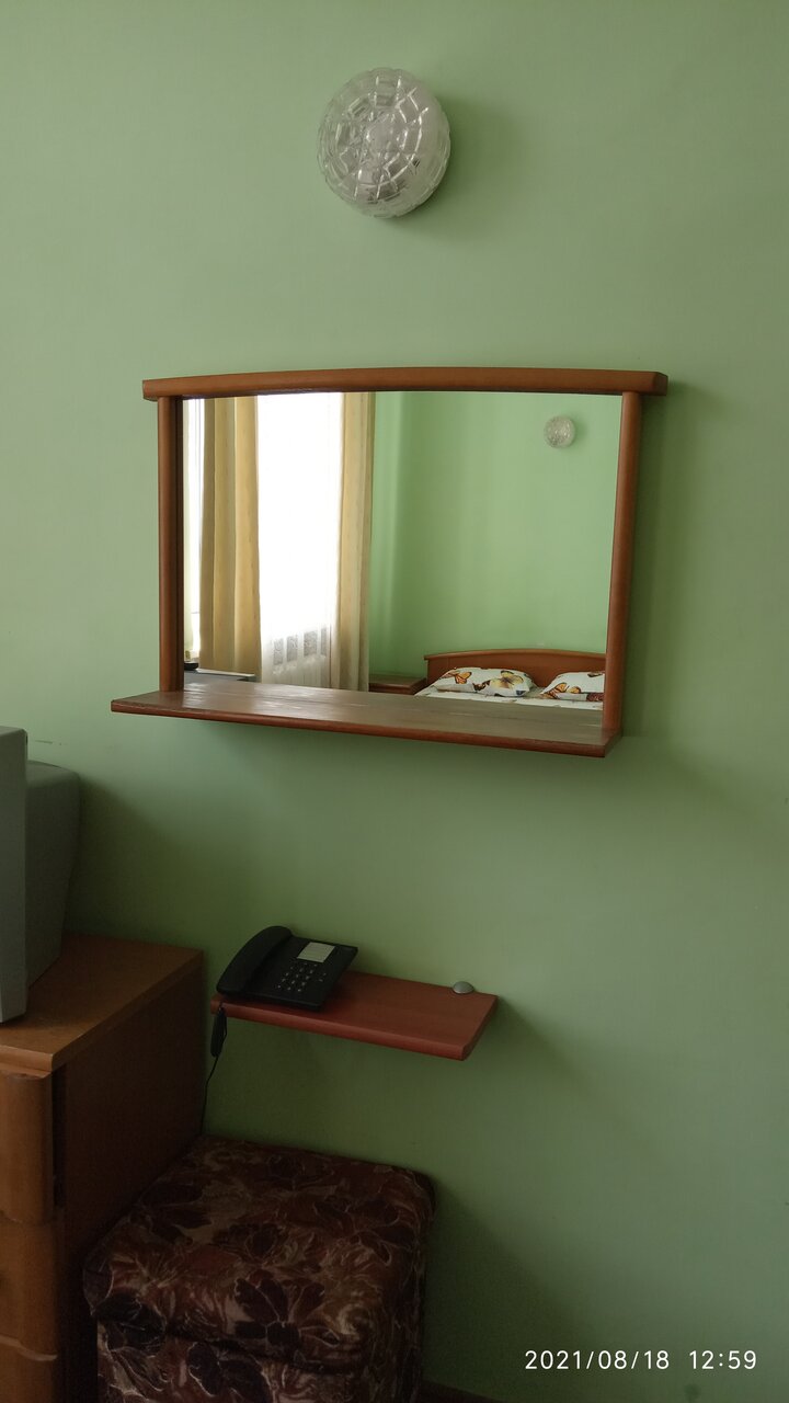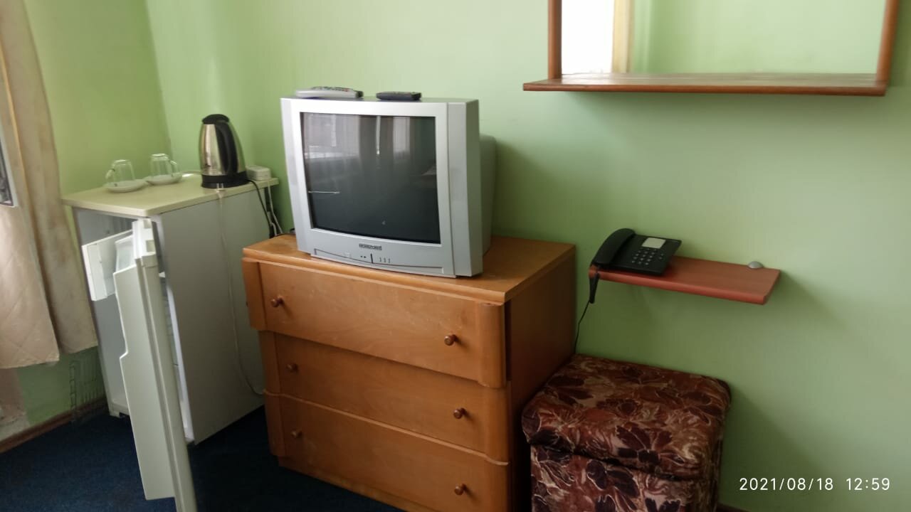 В номере холодно. Постоянно включали обогреватель. Кафе нет. Вода неприятно пахнет, так как из водонагревателя. Но из плюсов, был чайник и телек. Мебель сьарая и ушвтанная.