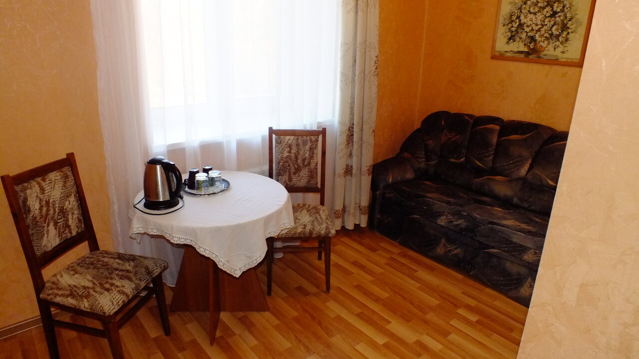 Просторный двухкомнатный номер с красивым интерьером предназначен для размещения двоих гостей на основных местах и двоих – на дополнительных местах (диван). Номера расположены в корпусе со 2 по 6 этажи.Площадь номера: 44 м2