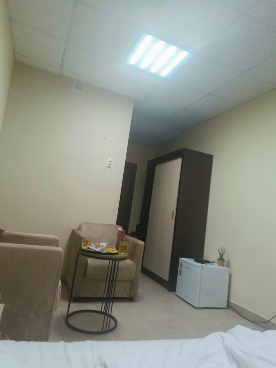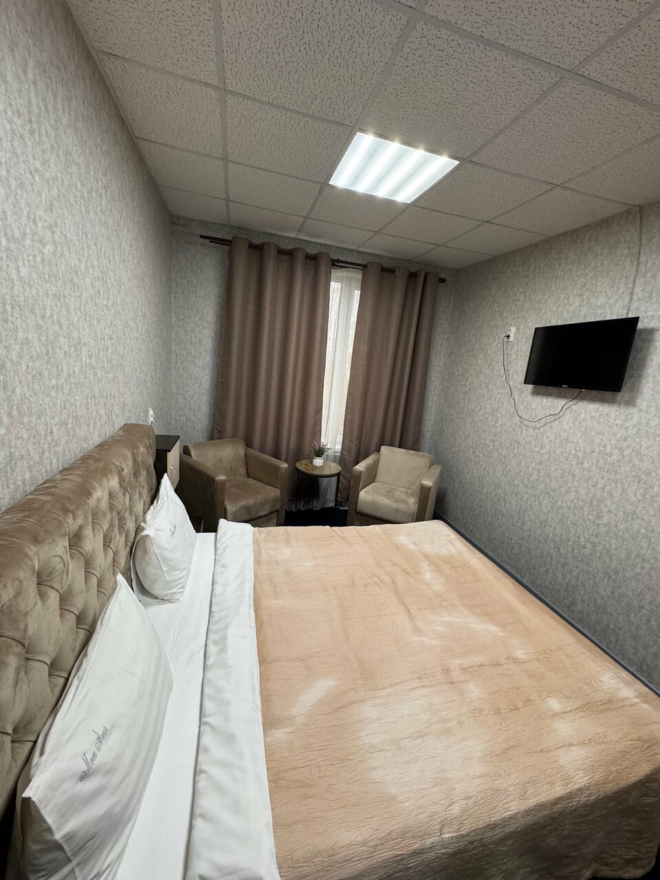 Номер так себе, останавливались проездом на одну ночь внезапно, поэтому не стали искать ничего другого. В номере нужно бы прям с нормальной химией сделать уборку, запах от коврового покрытия и штор. Постельное, сантехника чистые, иначе бы не остались. Ценник ща двухместный номер — 2500-2700, недорого, конечно, но и отель не фонтан далеко